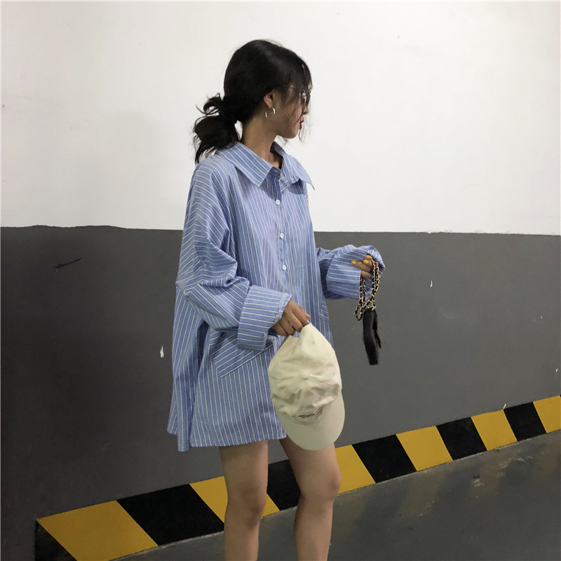 韓版時尚休閑氣質百搭小心機寬松男朋友襯衣女2018新款長袖中長款