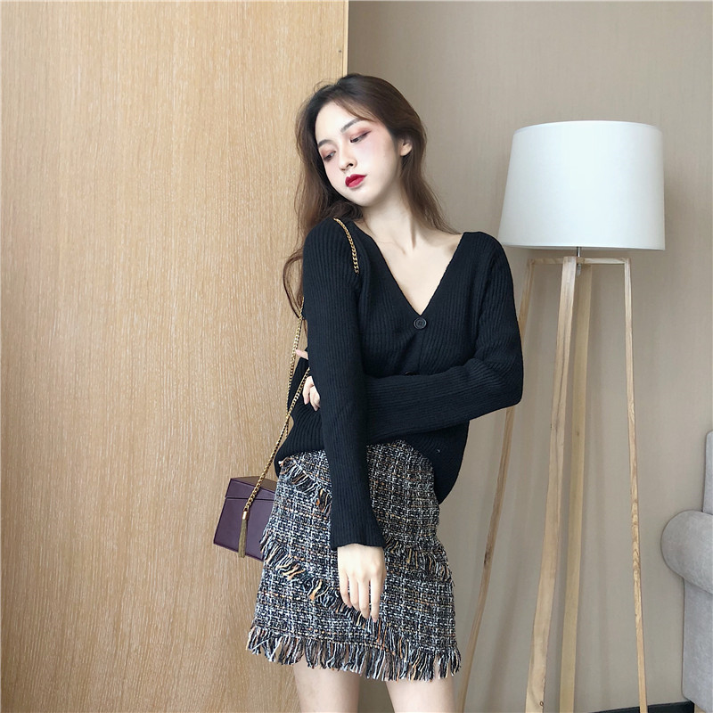 / 女神套裝秋裝2018新款V領喇叭袖毛衣針織開衫+粗呢高腰a字半身裙