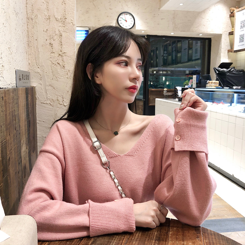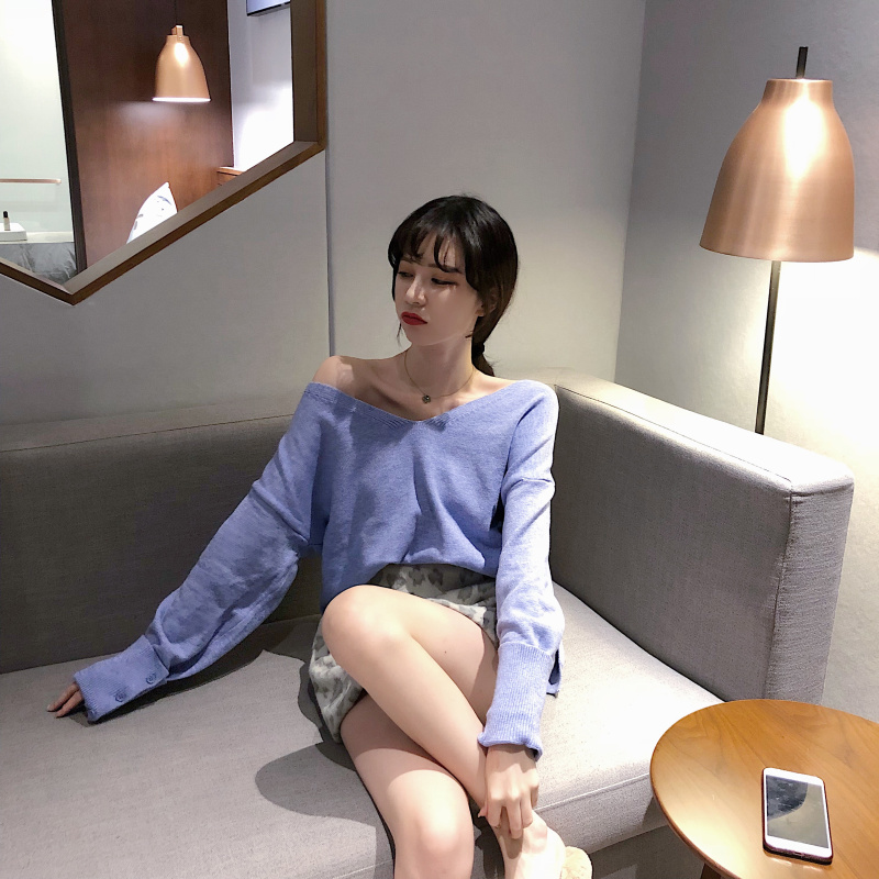 時尚網紅同款2018新款秋冬寬松慵懶風套頭毛衣女拼接不規則針織衫