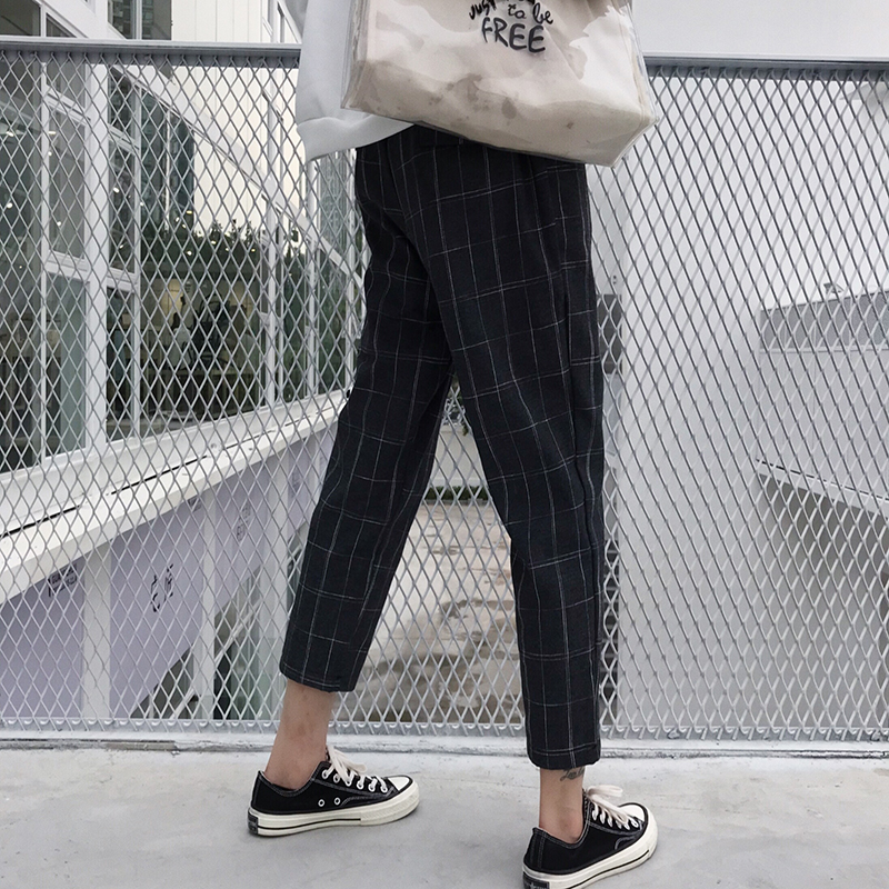 / 復古風格子松緊高腰顯瘦休閑褲秋冬裝新款怪味少女寬松哈倫八分褲