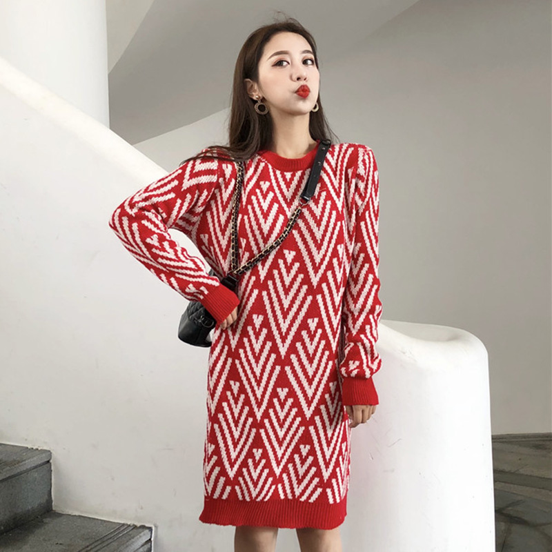 / 時尚撞色毛衣裙秋裝女2018新款法式少女茶歇裙圓領寬松長袖連衣裙