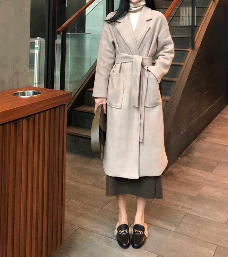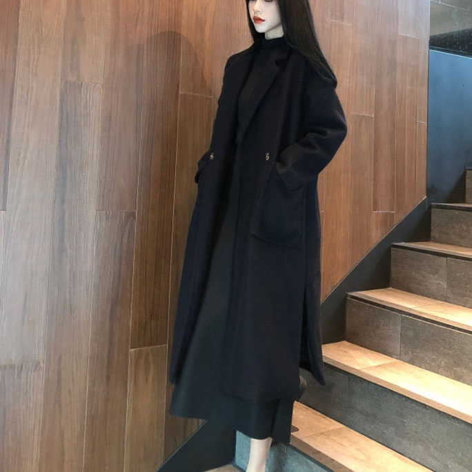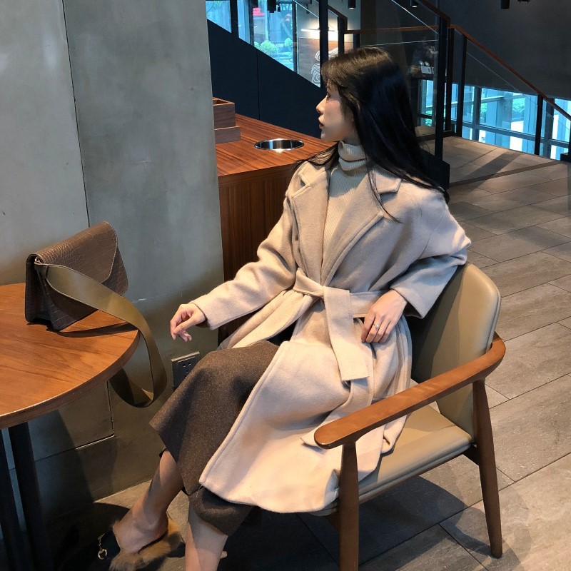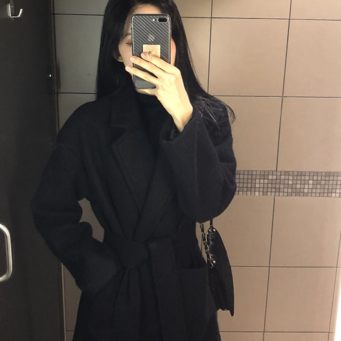 / 百搭韓版寬松中長款系帶過膝毛呢外套女秋冬2018新款大衣呢子上衣