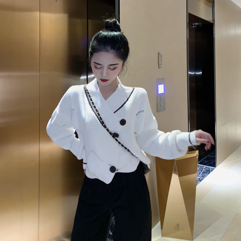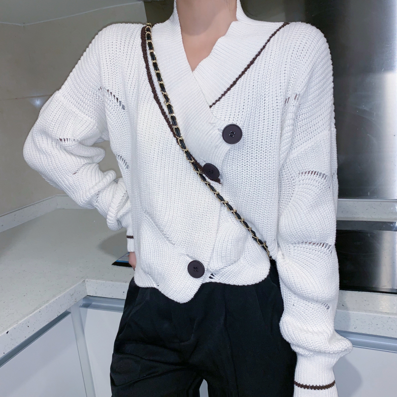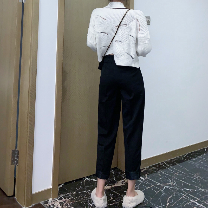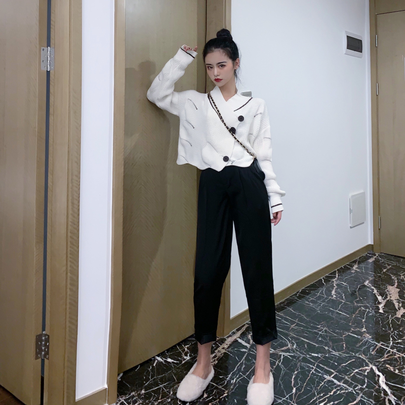 秋裝女2018新款復古短款外套V領慵懶鏤空毛衣女+高腰顯瘦休閑褲潮
