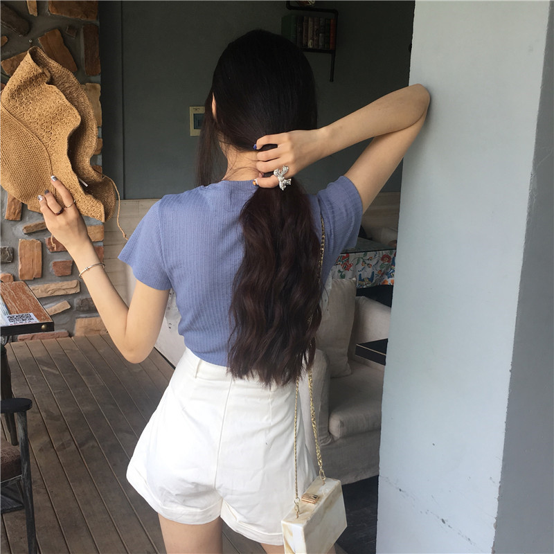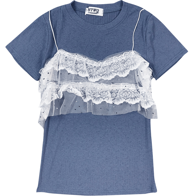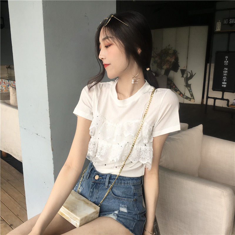 / 夏季韓版女裝新款蕾絲拼接假兩件上衣圓領短袖針織針織衫百搭T恤