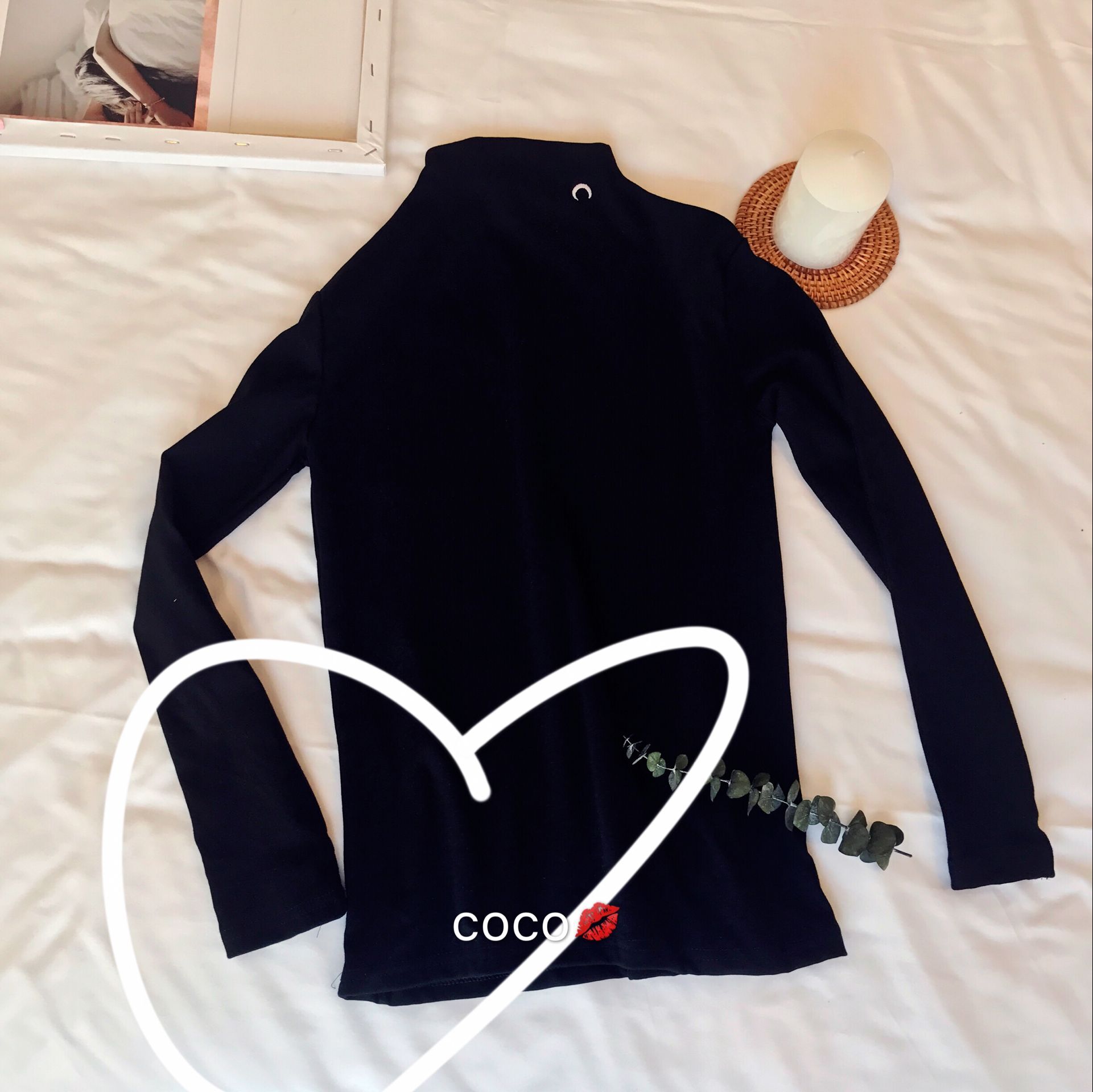 / 冬裝上衣女慵懶長袖t袖女月亮刺繡打底字母半高領加薄絨百搭打底
