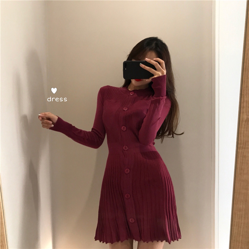 / 韓版時尚秋裝女2018新款氣質百搭款百褶裙針織拼接紐扣連衣裙短裙