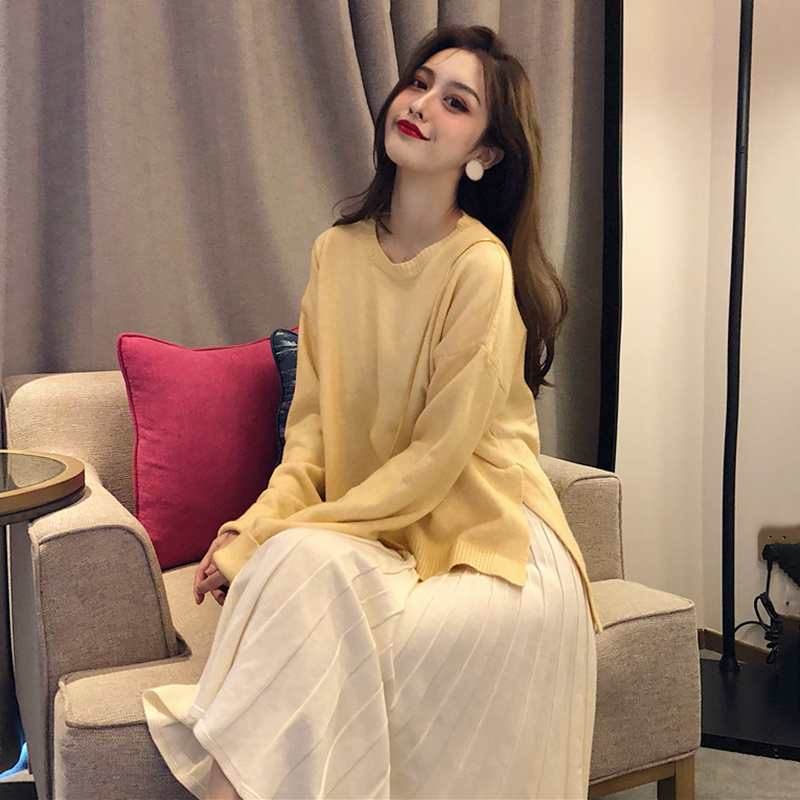 秋冬女裝新款寬松慵懶毛衣針織外套配高腰A字百褶半身裙子兩件套