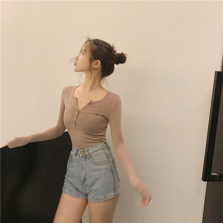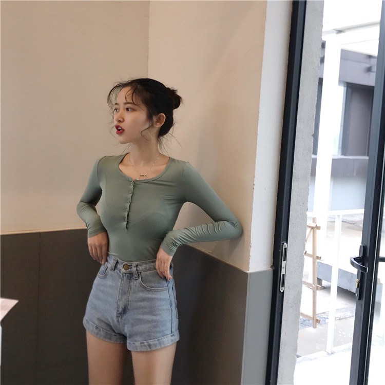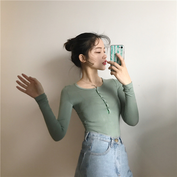 夏裝2018新款女chic氣質修身顯瘦性感T恤百搭緊身女純色長袖上衣