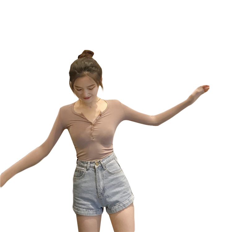 秋天上衣女時尚韓版深V領性感純色長袖T恤修身顯瘦打底長袖T恤潮
