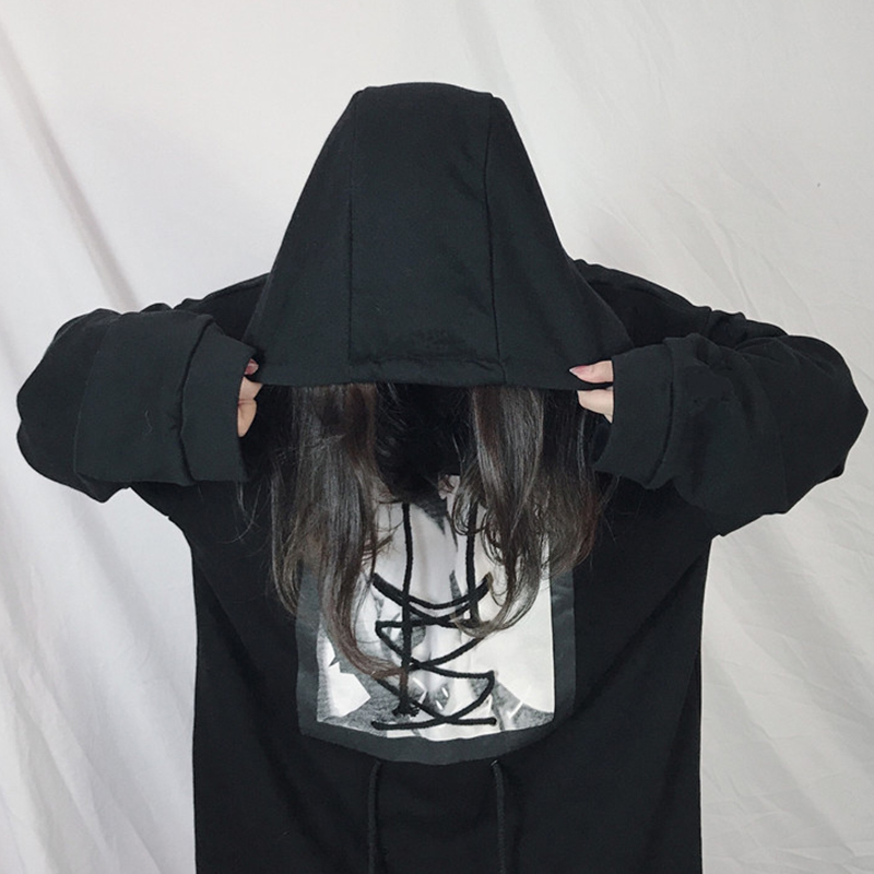 / 原宿風中長印花連帽衛衣秋裝女2018新款韓版學生寬松長袖上衣外套