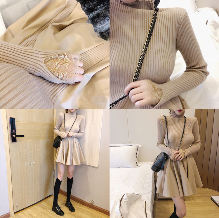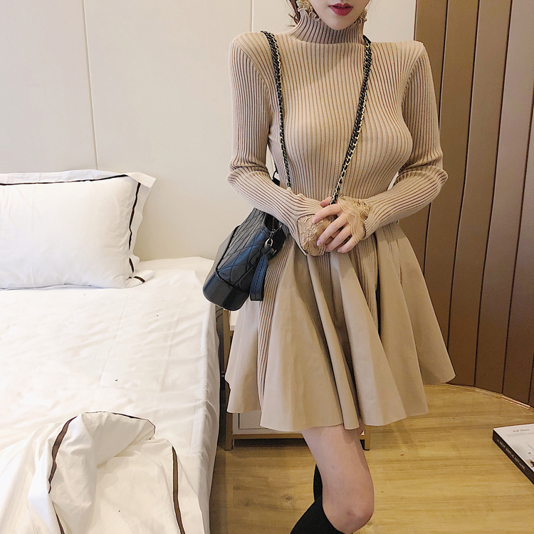 冬裝女2018新款裙子毛衣時尚女神顯瘦拼接皮高領百搭打底連衣裙女