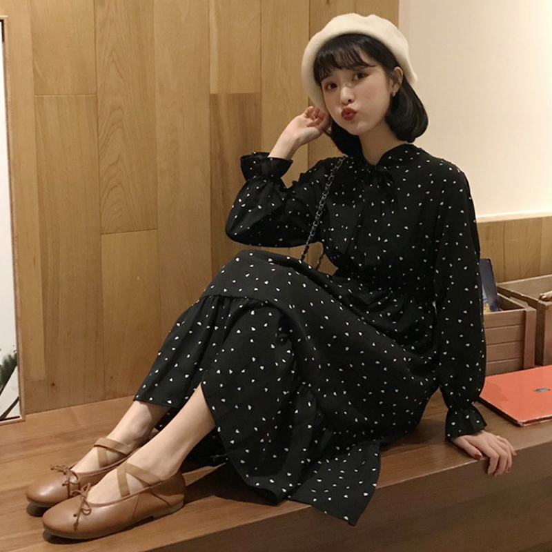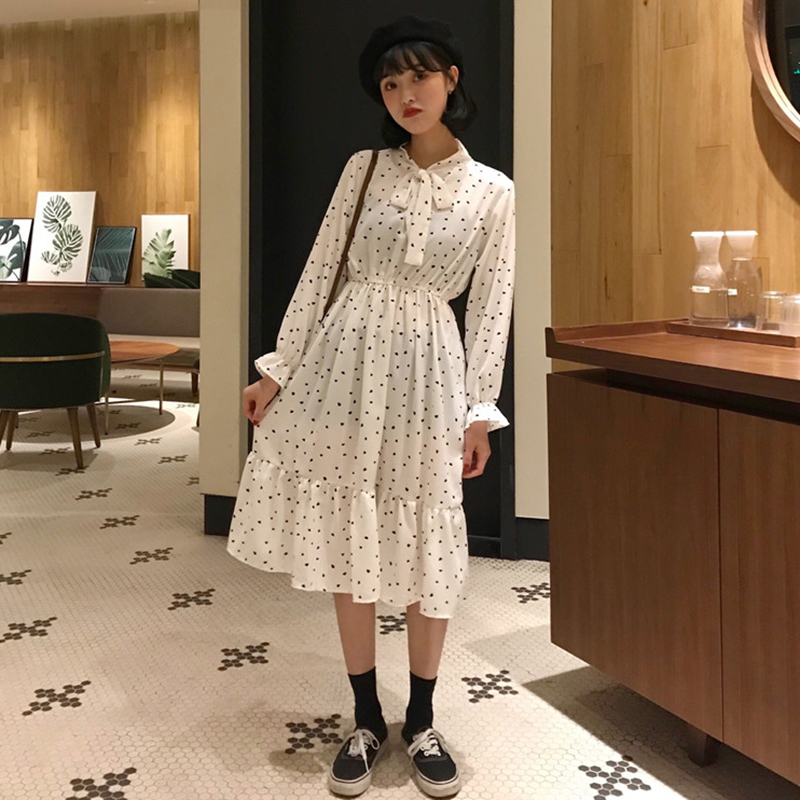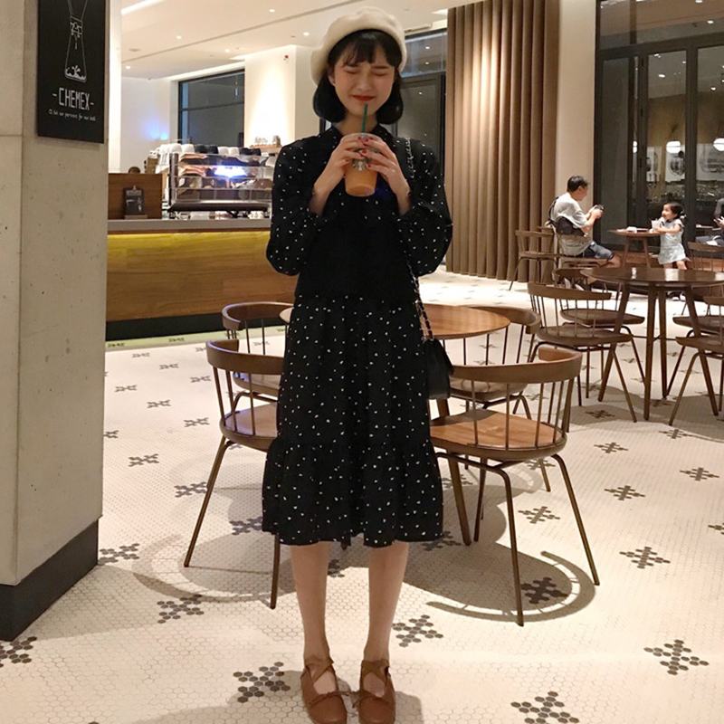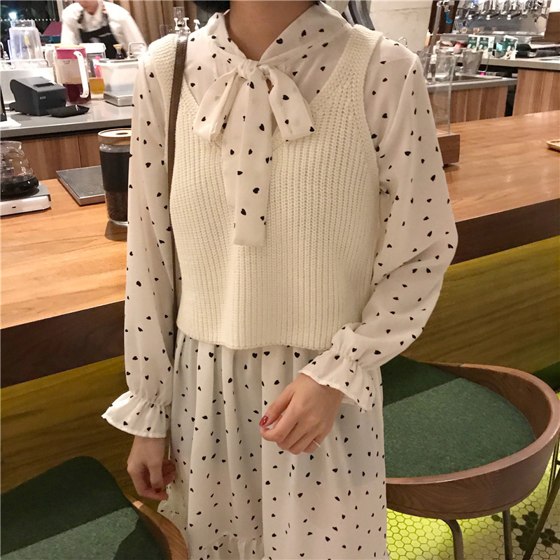 / 兩件套女秋裝新款休閑系帶波點長袖雪紡連衣裙外穿針織馬甲短背心