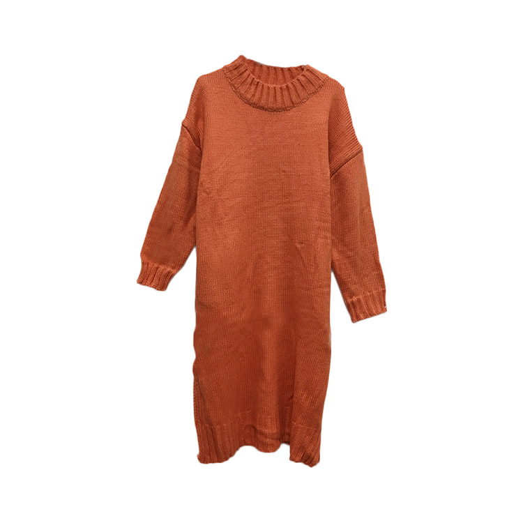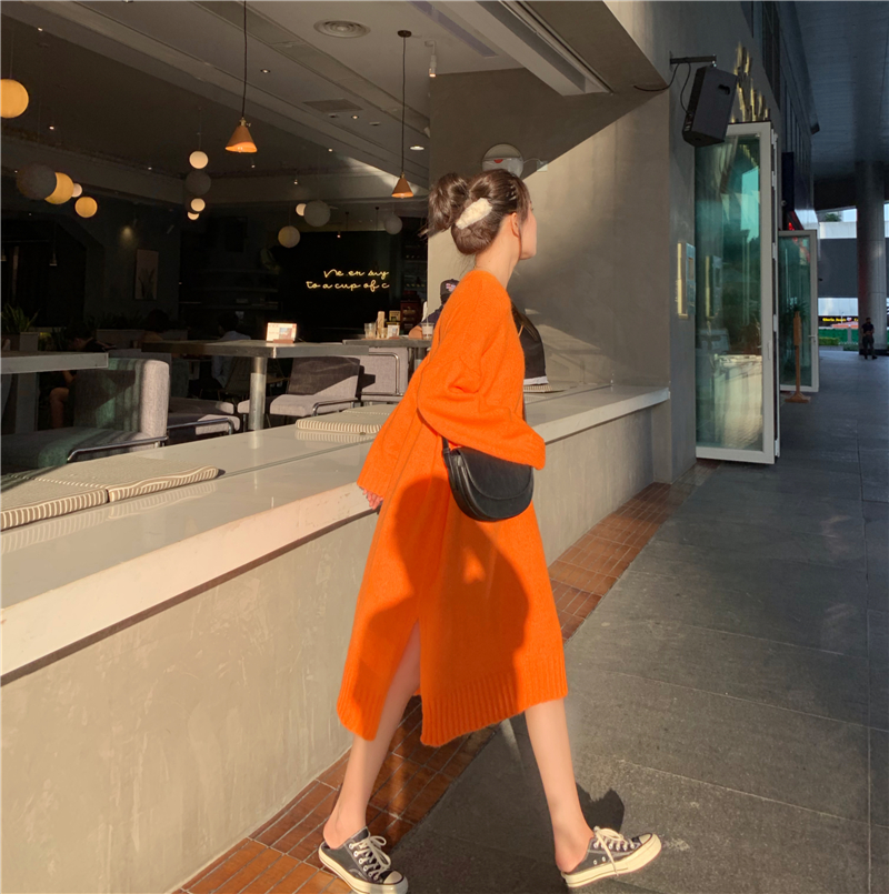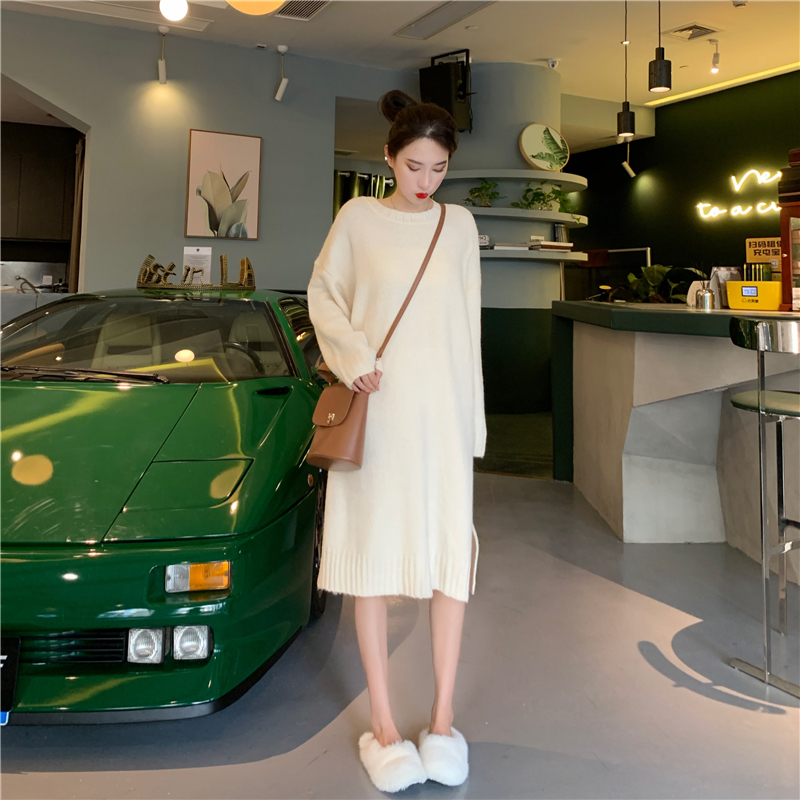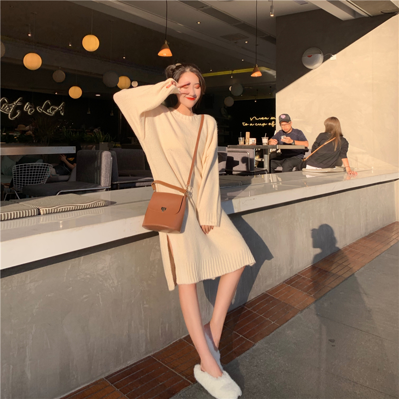 韓版秋裝女2018新款裙子套頭開叉長過膝毛衣裙寬松長袖針織連衣裙