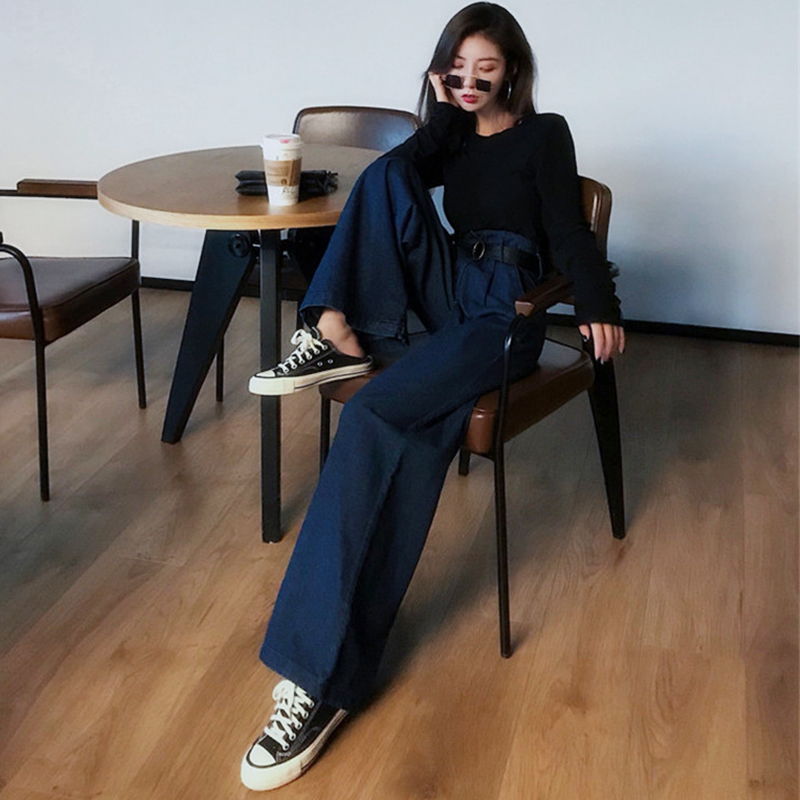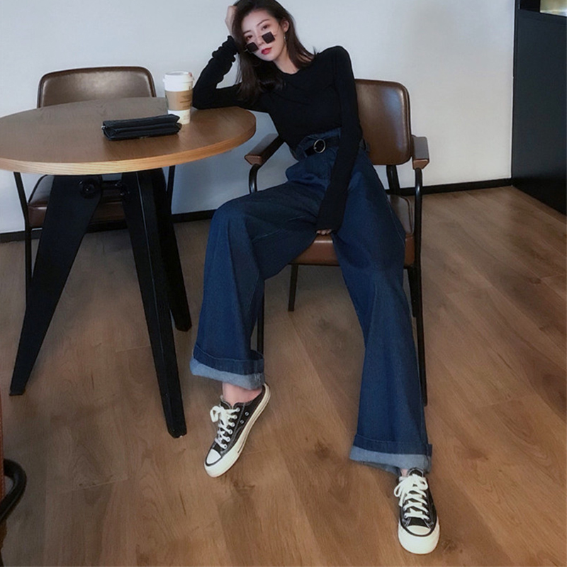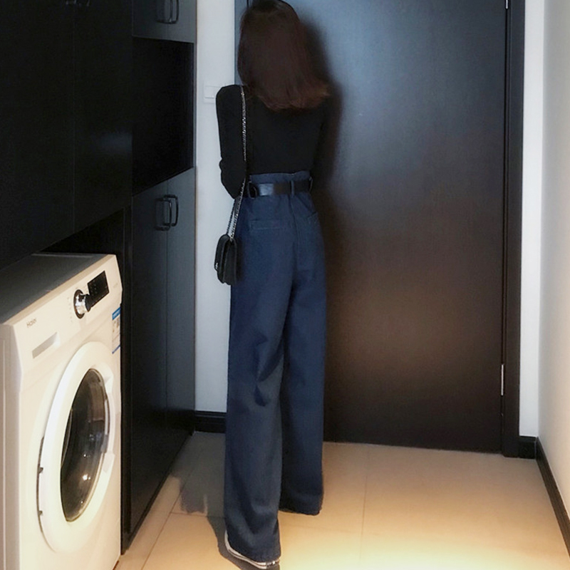 時尚直筒闊腿牛仔褲秋裝女2018新款復古港味高腰寬松拖地長褲子潮