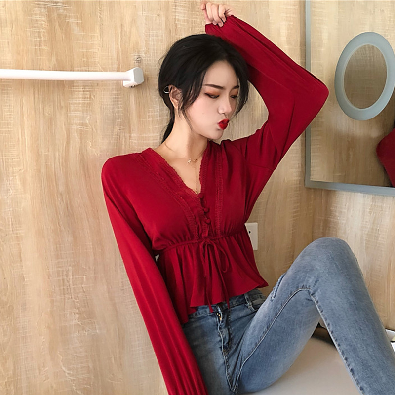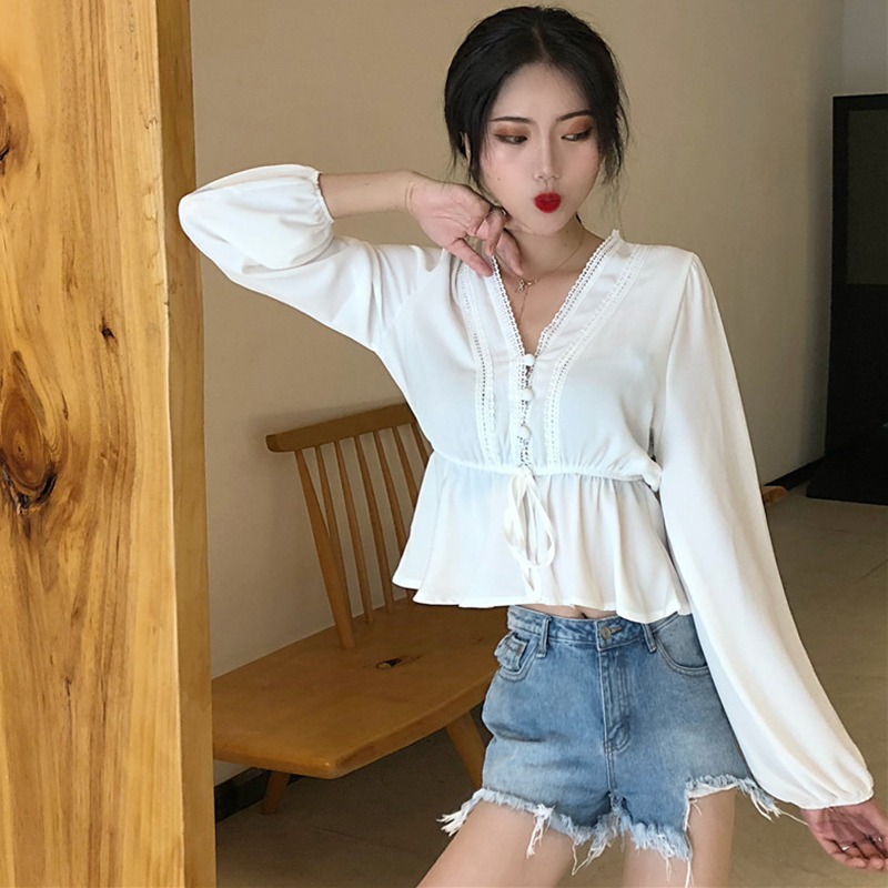 / 白襯衫女秋裝新款花邊V領燈籠長袖襯衣韓版百搭高腰短款氣質上衣