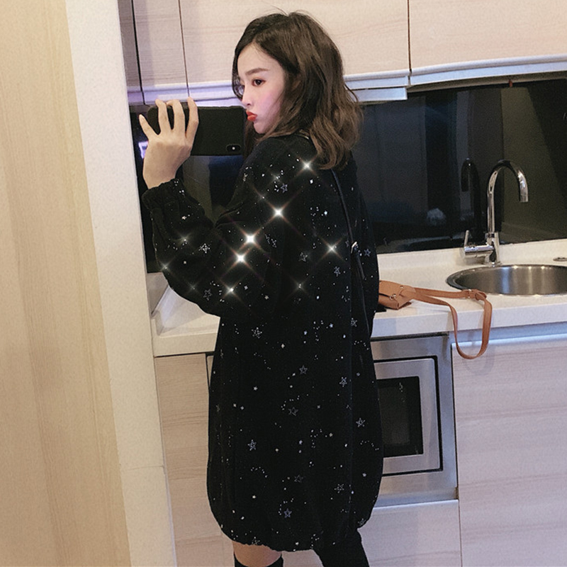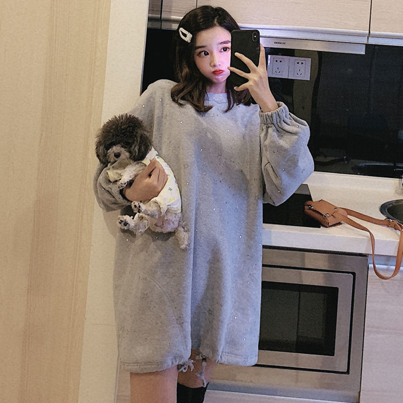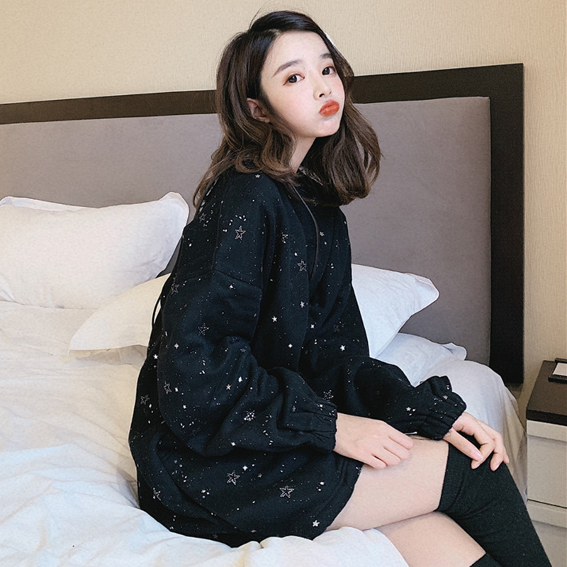 / 抽繩中長款加絨套頭衛衣2018新款女秋冬裝港風印花外套休閑上衣潮