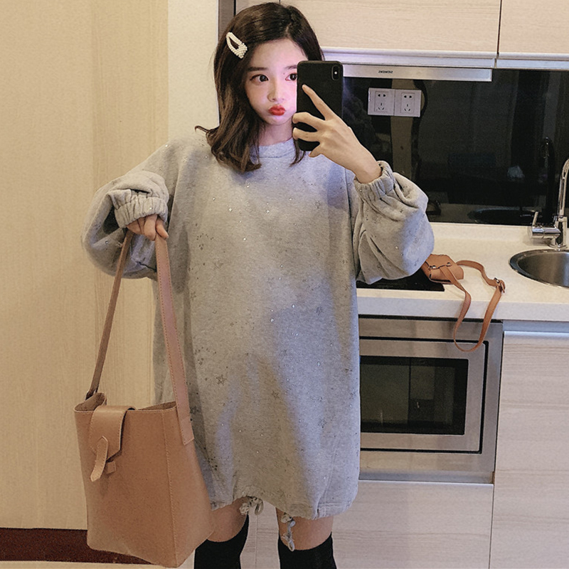 抽繩中長款加絨套頭衛衣2018新款女秋冬裝港風印花外套休閑上衣潮