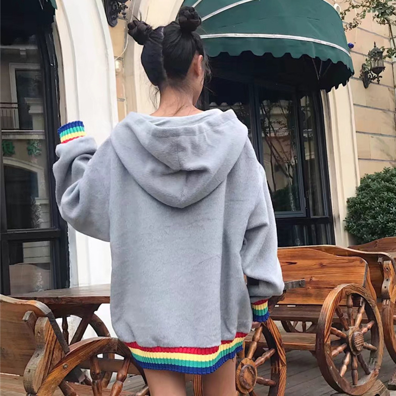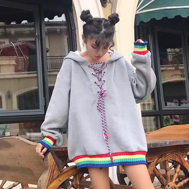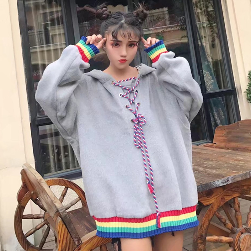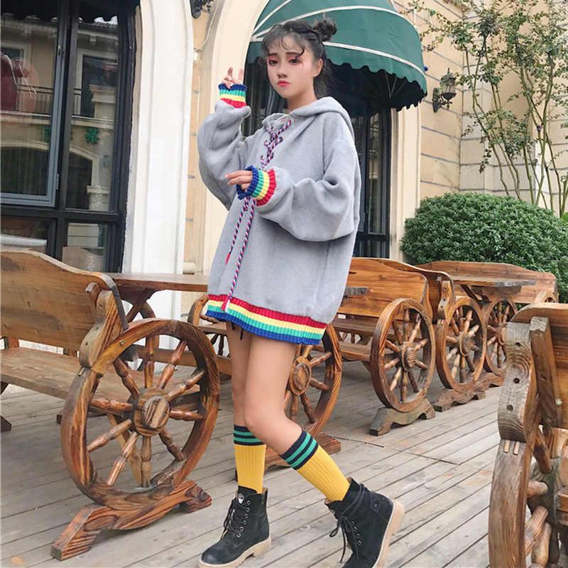 / 秋冬新款韓版女裝彩虹袖拼接抽繩綁帶加絨衛衣學生中長款連帽外套