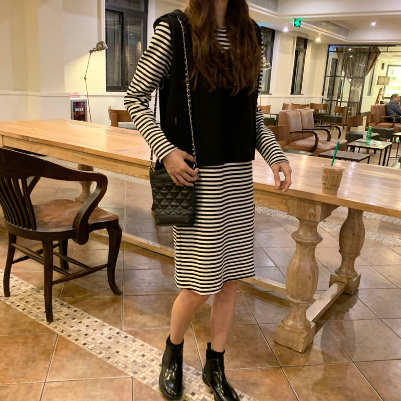 / 氣質女神兩件套秋冬新款韓版百搭連帽短外套寬松顯瘦條紋連衣裙子