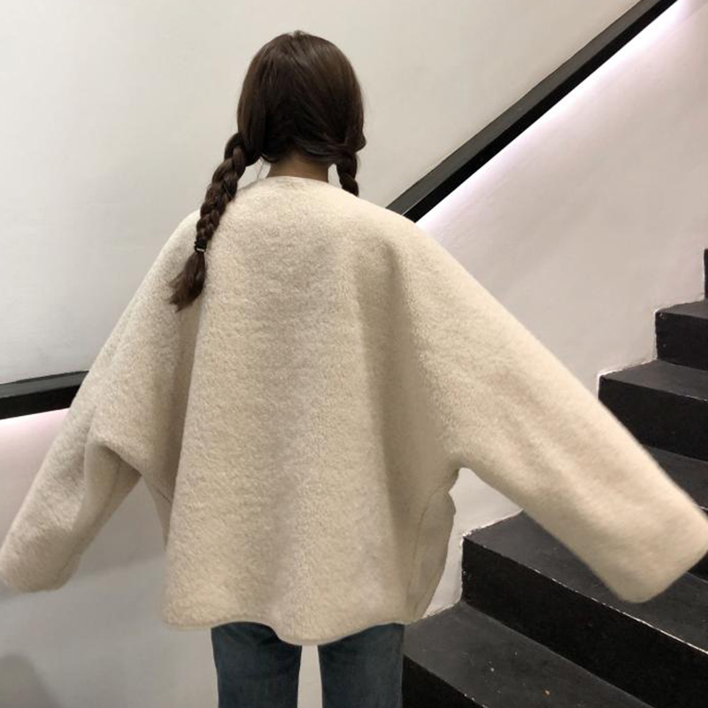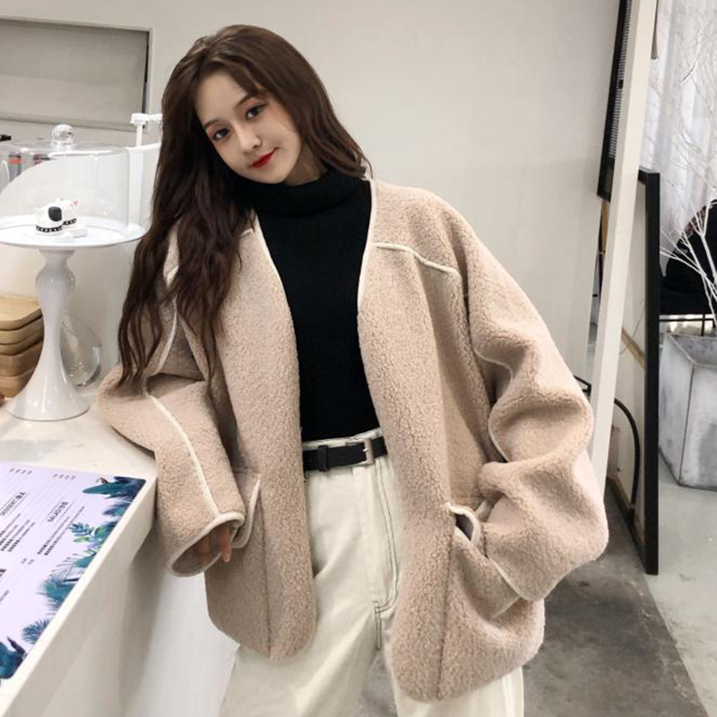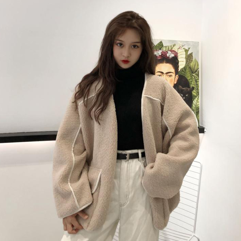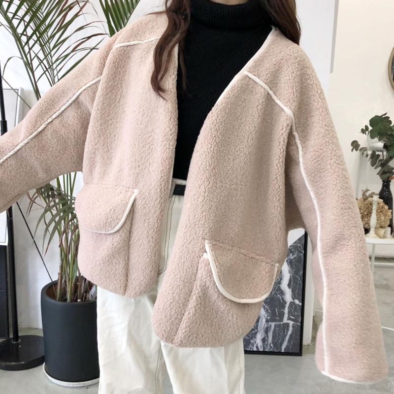 / 少女羊羔毛外套秋冬裝新款撞色包邊毛絨上衣時尚寬松口袋長袖開衫