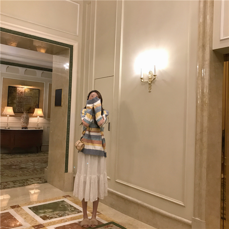 / 復古甜美軟糯不起球彩虹毛衣+小清新雪紡高腰半身裙套裝兩件套潮