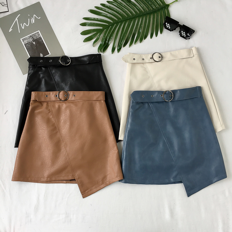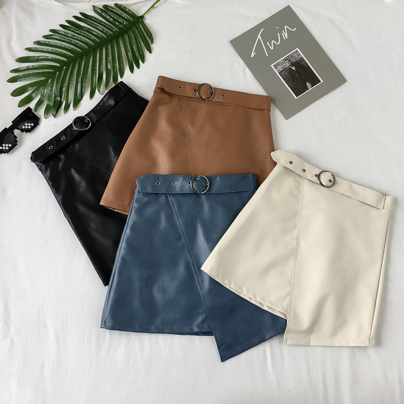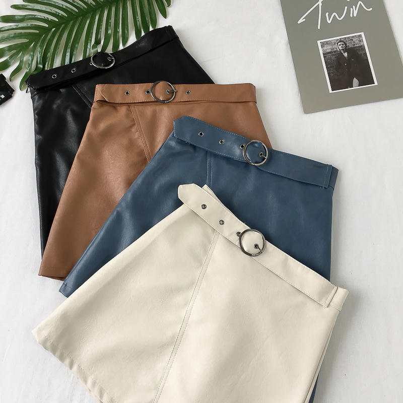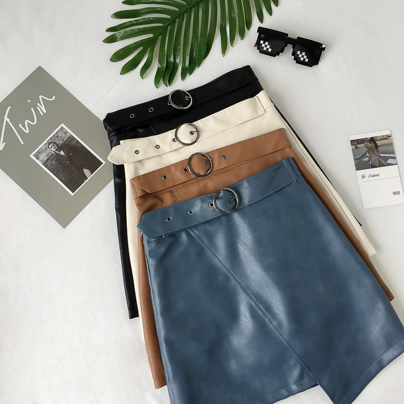 韓版個性收腰系帶扣高腰顯瘦PU皮短裙秋裝女2018新款百搭半身裙