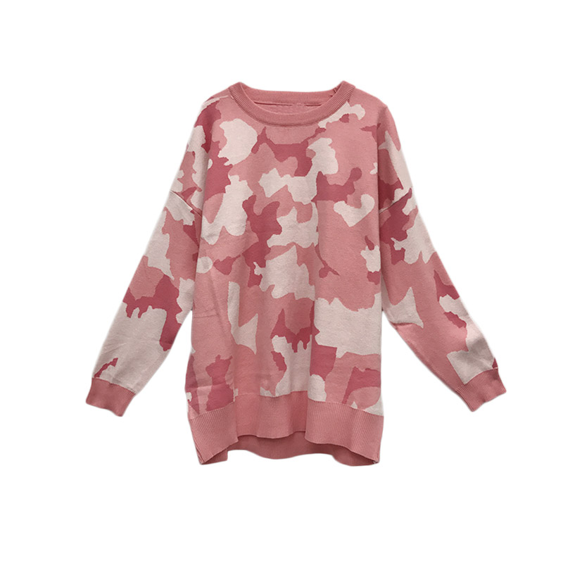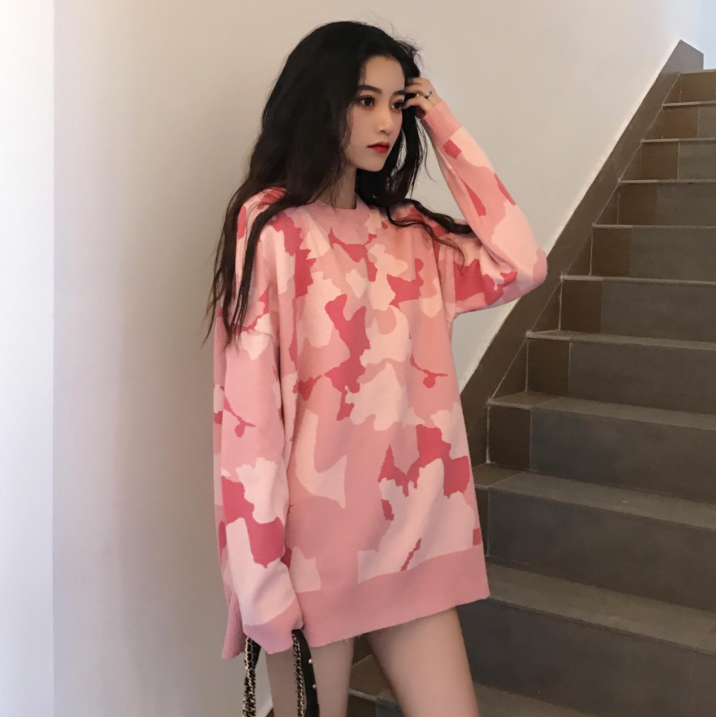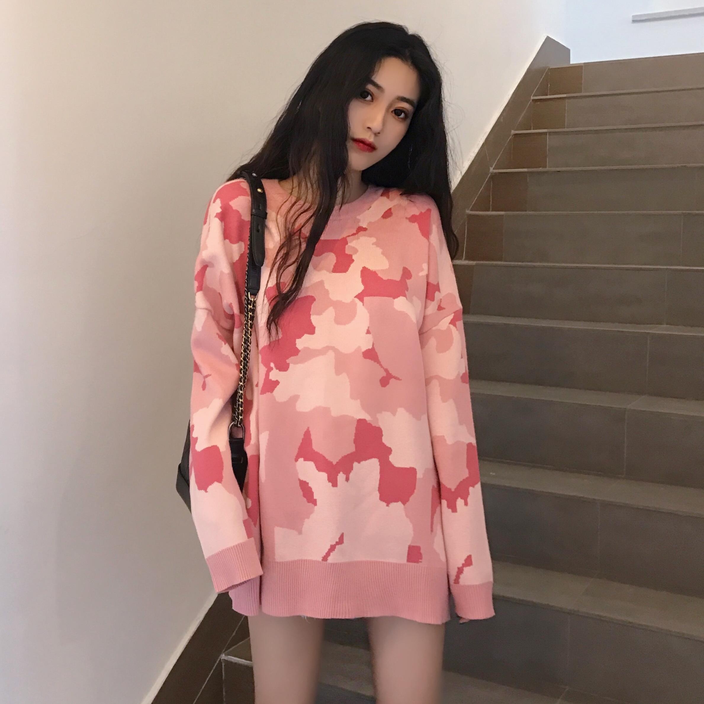 秋裝女2018新款韓版迷彩針織衫慵懶寬松oversize中長款網紅毛衣潮