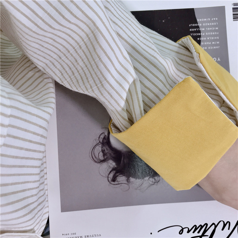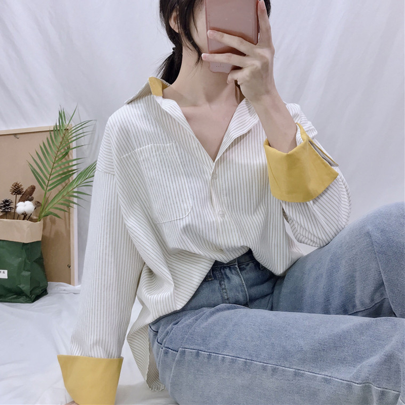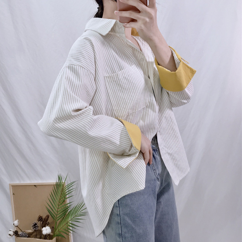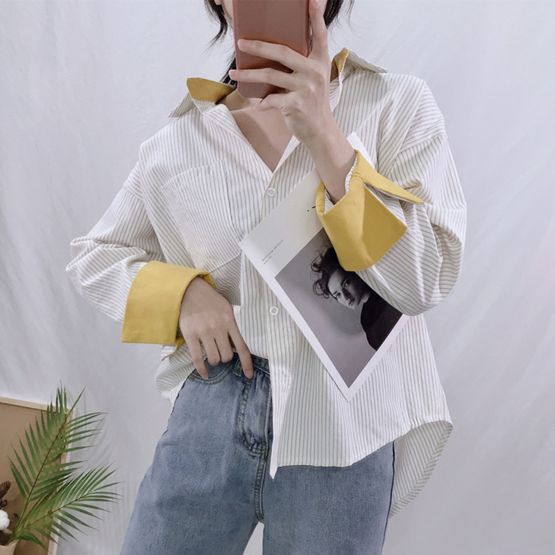 / 時尚拼色翻領中長款襯衣秋裝女2018新款條紋休閑襯衫學生長袖上衣