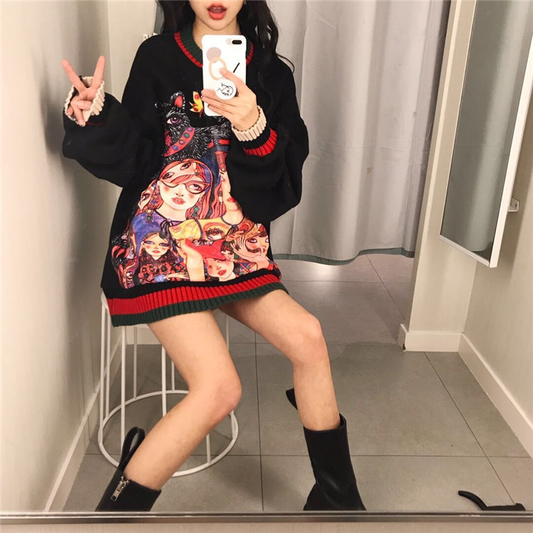 港味個性繪畫印花衛衣女秋2018新款寬松撞色中長款加絨套頭上衣潮