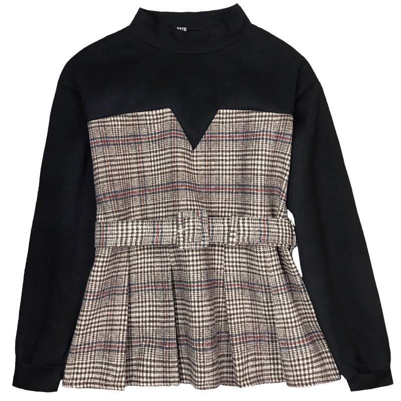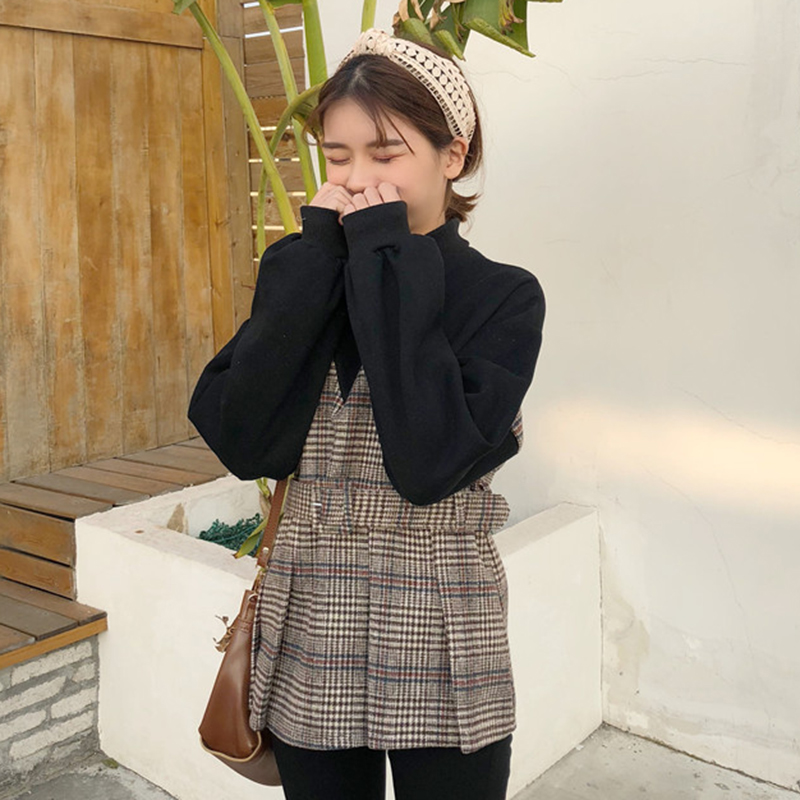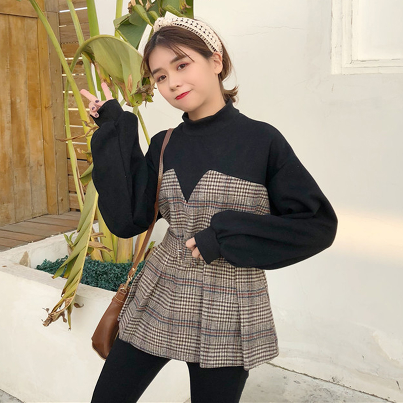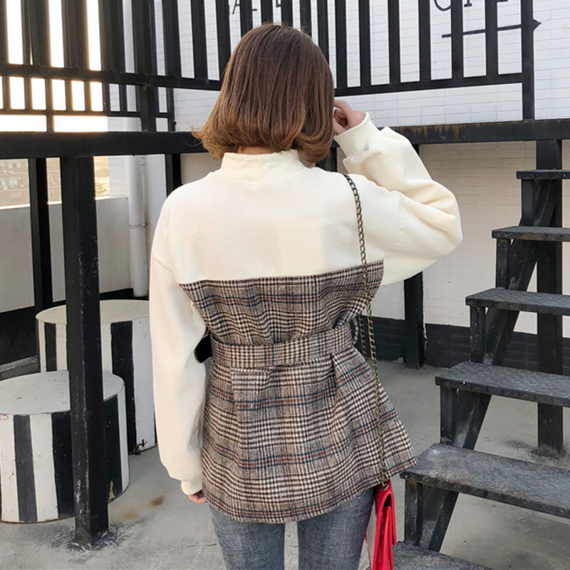 / 秋冬女裝2018新款韓版寬松收腰格子拼接假兩件加絨打底衫衛衣上衣