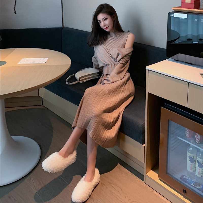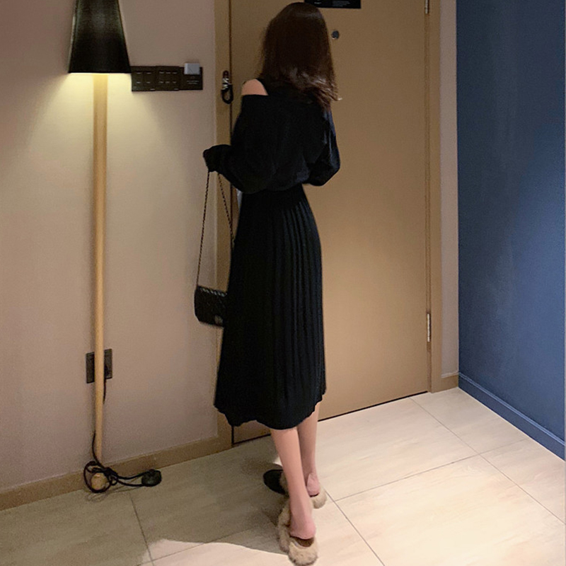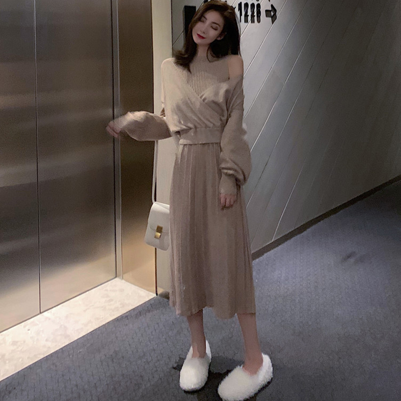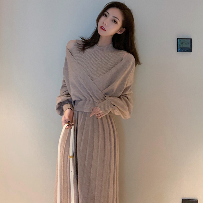 / 赫本風套裝女秋冬新款修身顯瘦V領短款毛衣氣質百褶背心連衣裙子