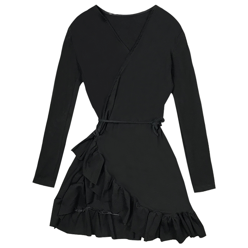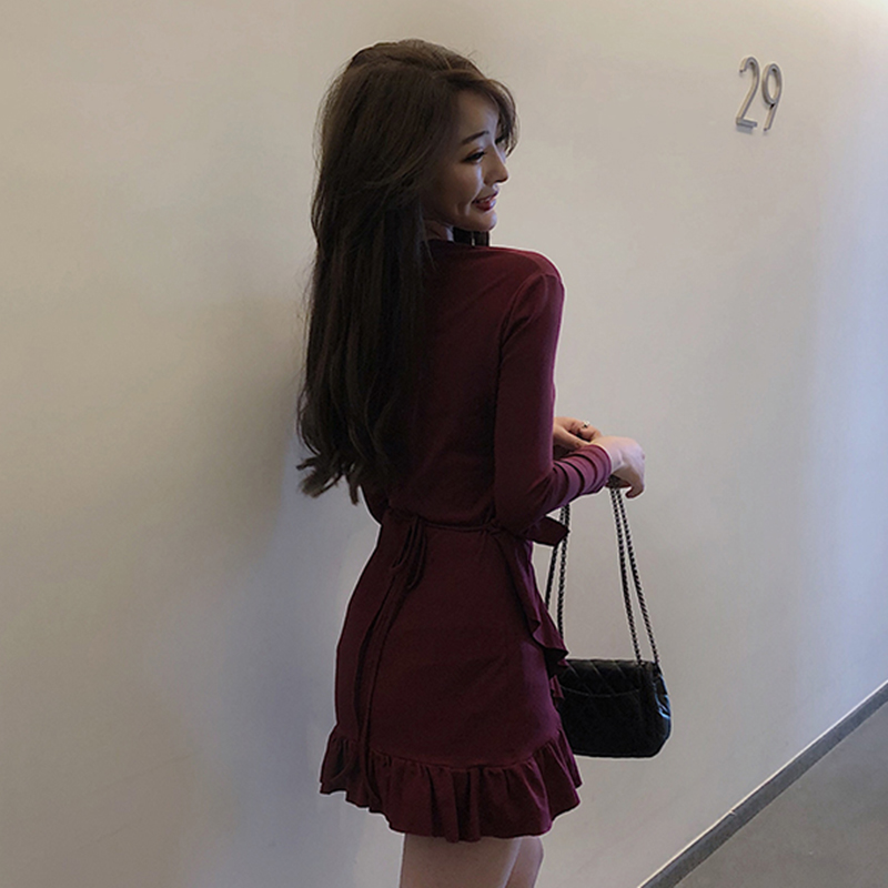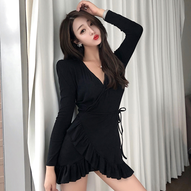 / 時尚V領長袖荷葉邊連衣裙女秋裝新款修身顯瘦包臀裙一片式A字裙子