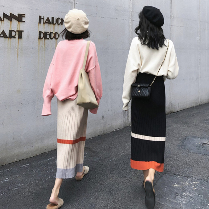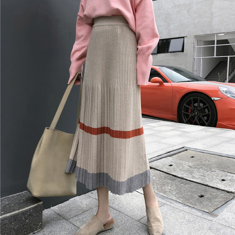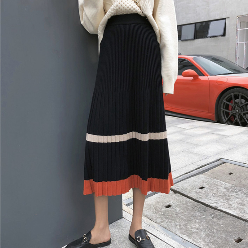 / 秋冬女裝2018新款韓版復古風撞色針織半身裙學生A字百褶中長裙子