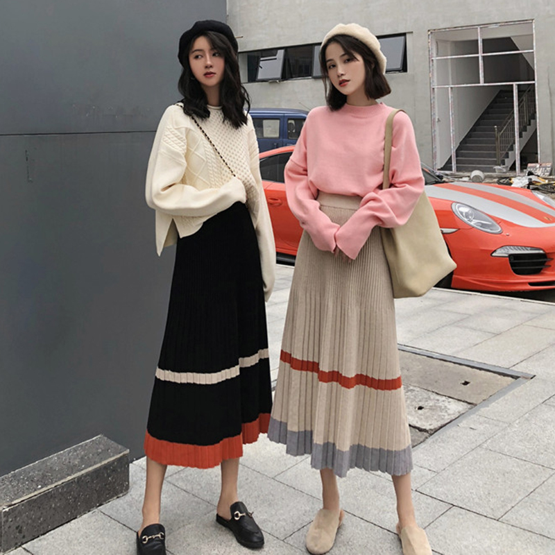 秋冬女裝2018新款韓版復古風撞色針織半身裙學生A字百褶中長裙子