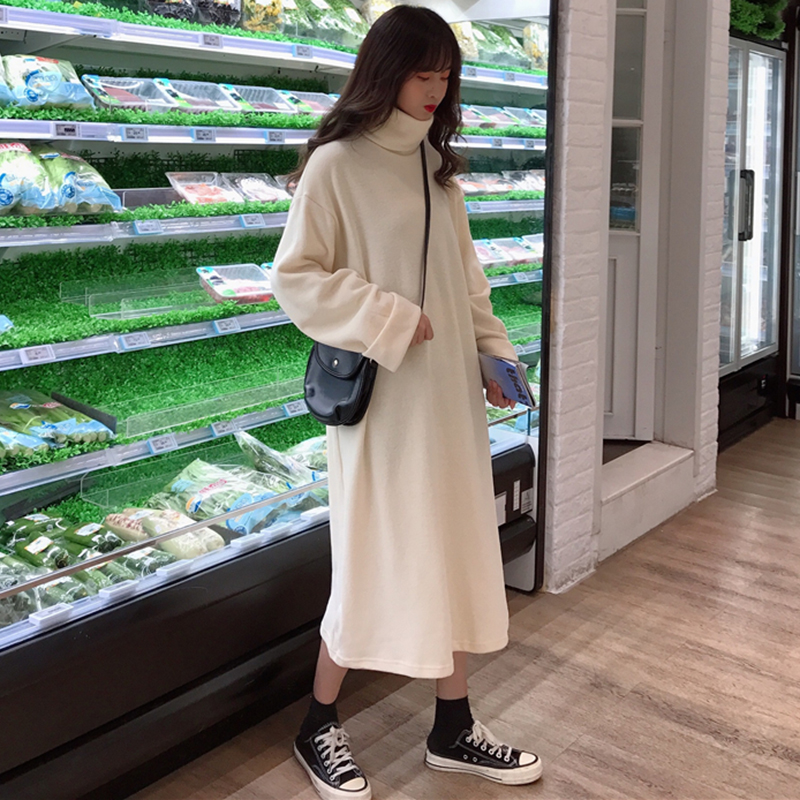 / 寬松高領學生黑色長袖連衣裙子女秋冬裝新款法式復古egg風衛衣裙