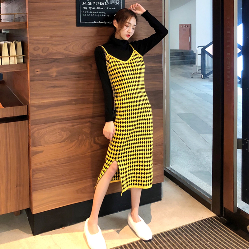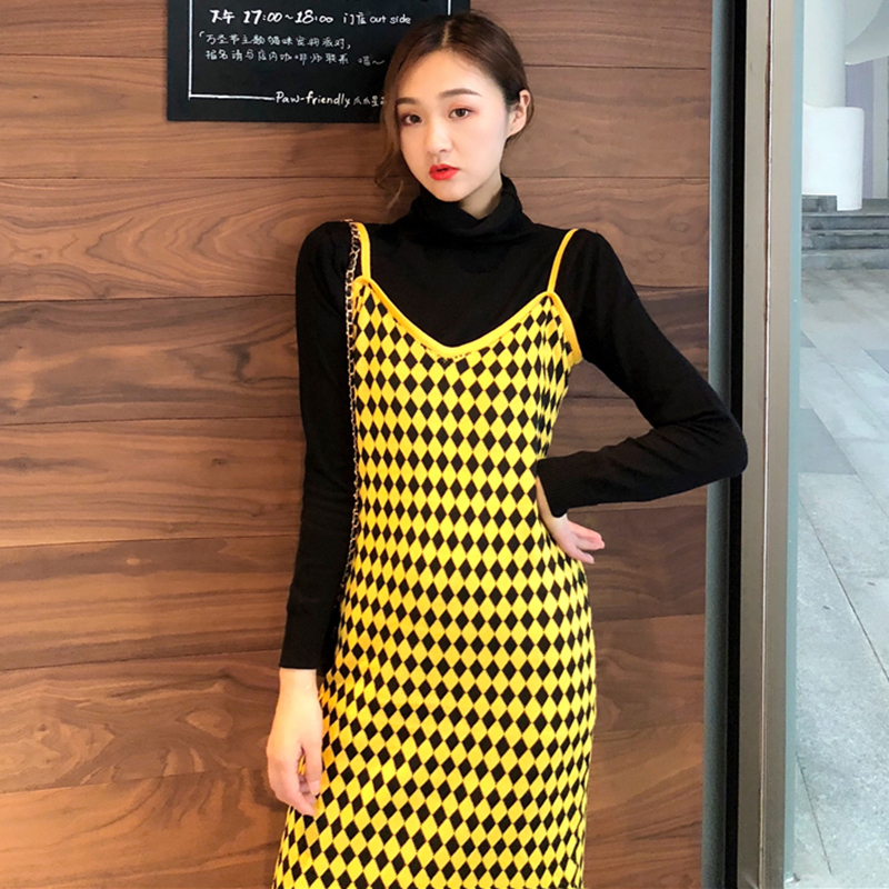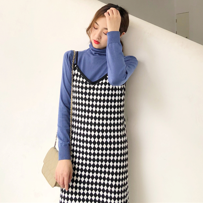 / 洋氣套裝女秋冬新款修身高領長袖打底衫時尚格子V領吊帶針織裙子