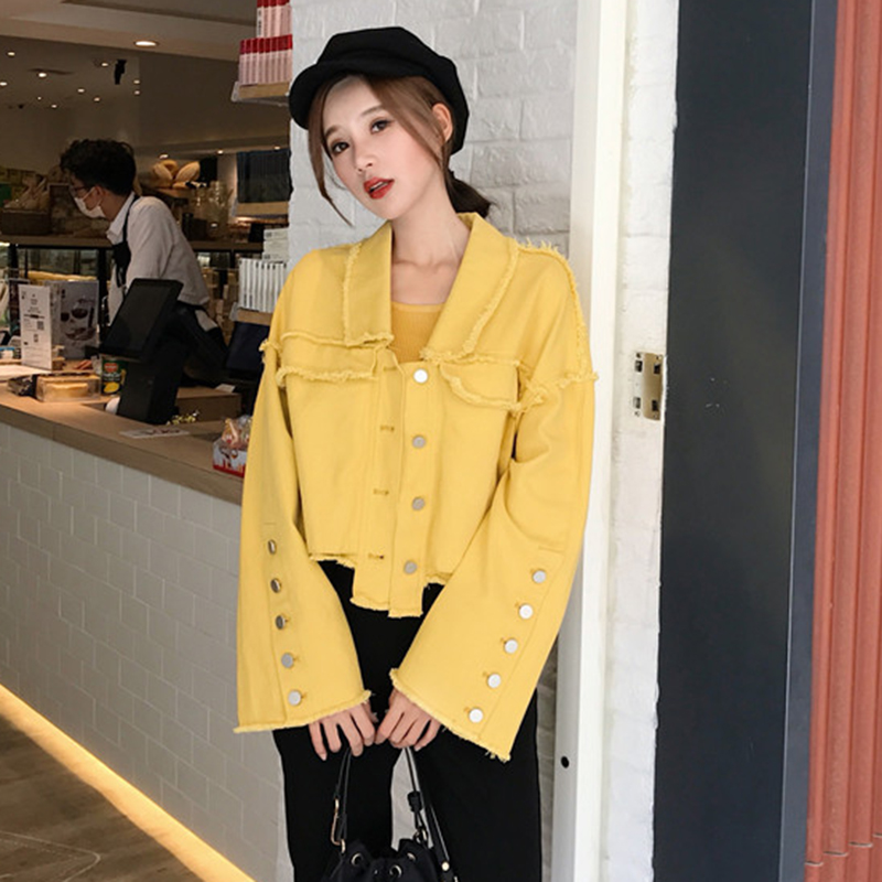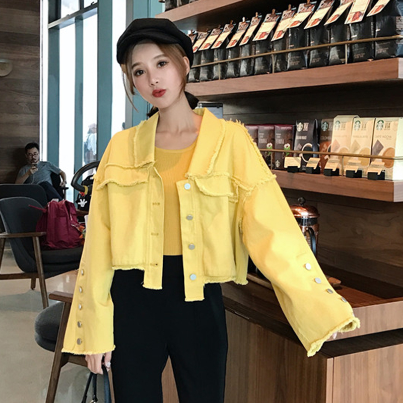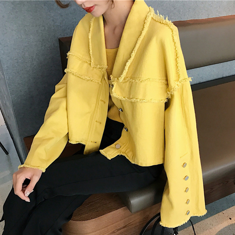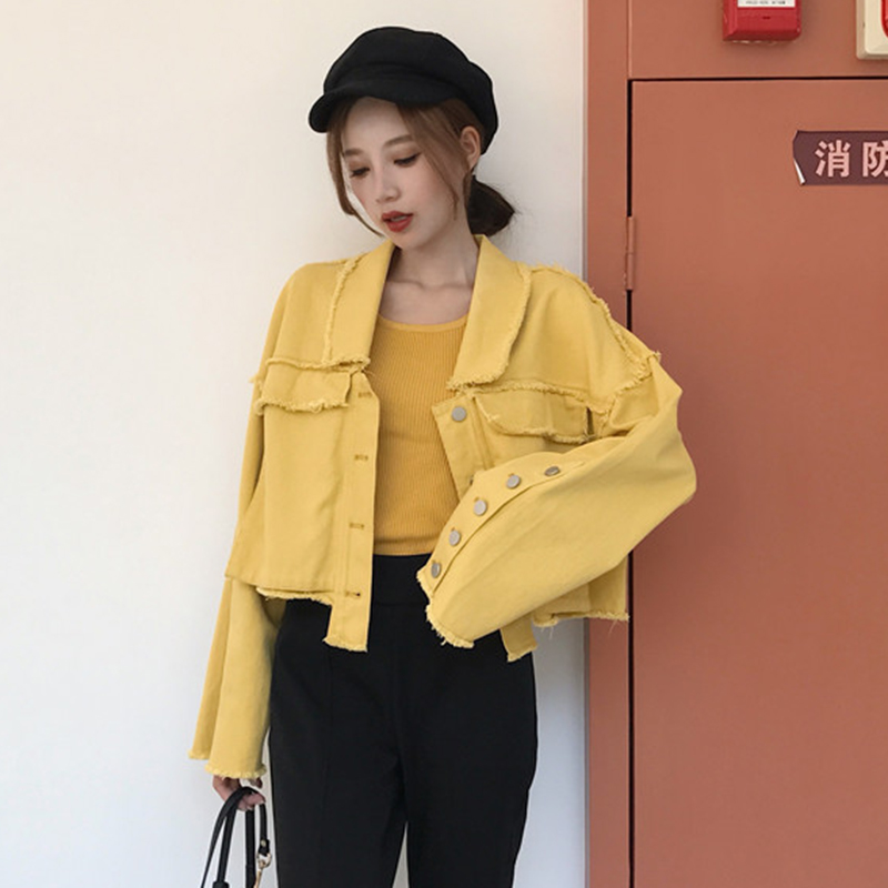 / 休閑薄款黃色牛仔短外套秋裝女新款韓版寬松水洗磨破長袖夾克上衣