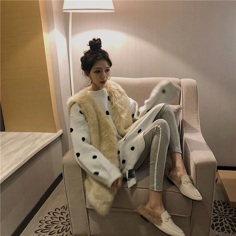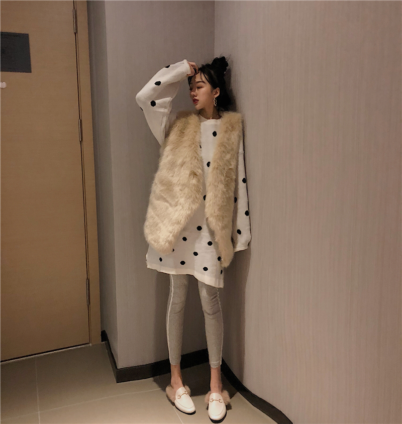 / 女神套裝秋冬寬松大版點點套頭毛呢連衣裙+皮草仿水貂絨毛毛馬夾