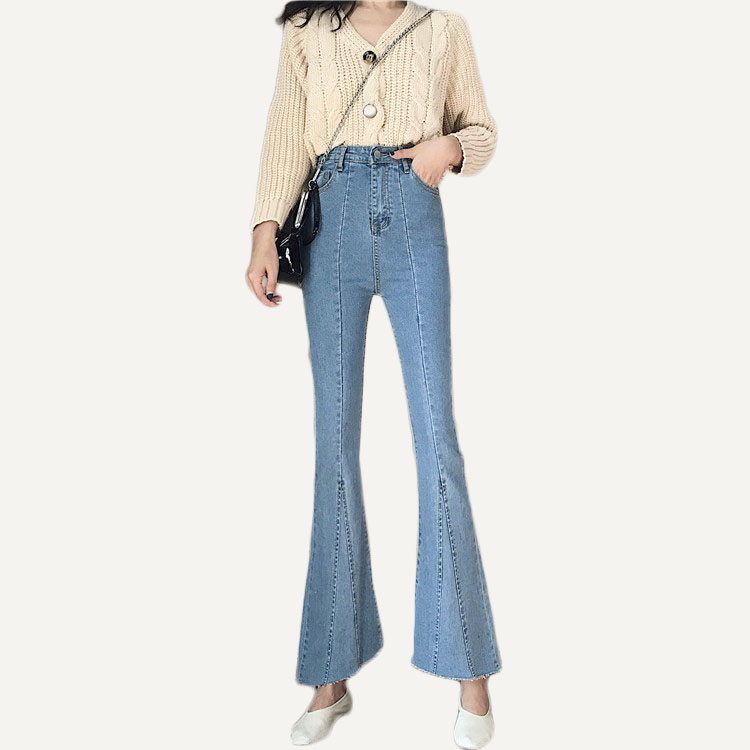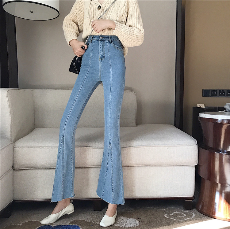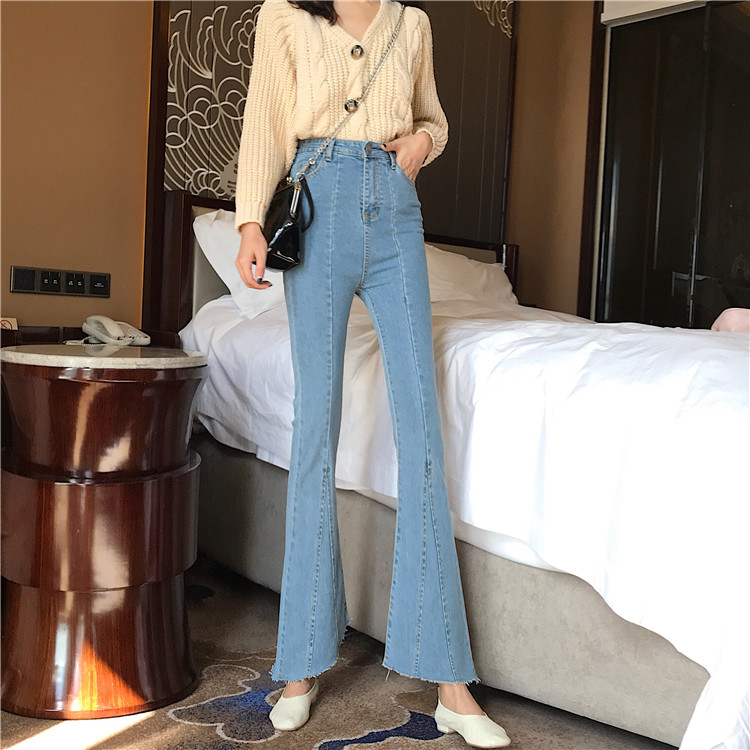 / 韓版港味復古chic褲子彈力高腰顯瘦修身拼接長褲毛邊微喇叭牛仔褲