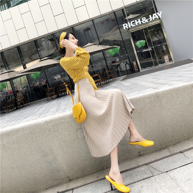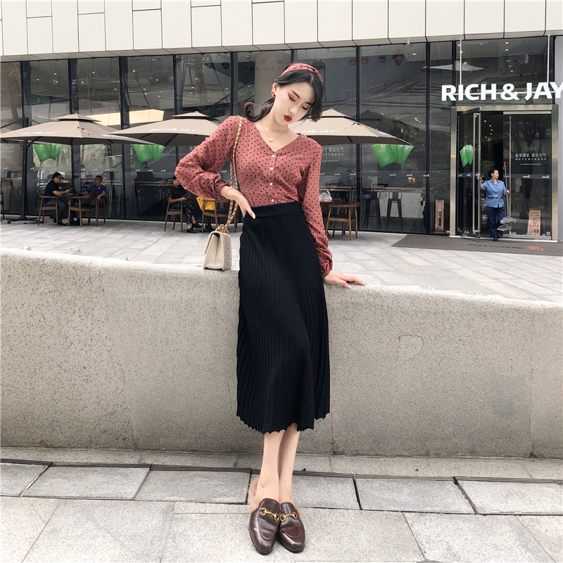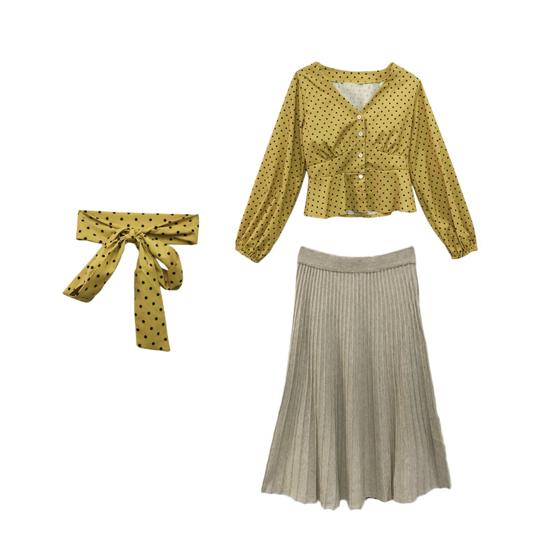 秋裝女2018新款套裝時尚兩件套復古波點襯衫配頭巾+A字針織百褶裙