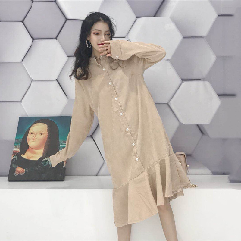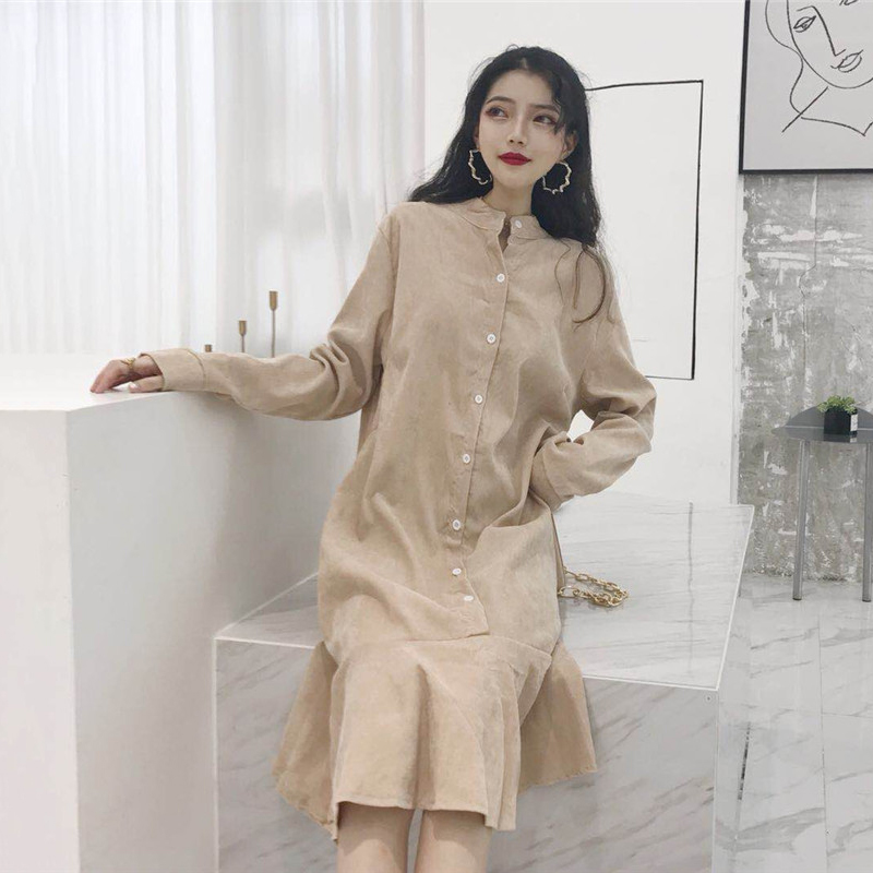 / 法式少女茶歇裙連衣裙秋裝2018新款女長袖扣子寬松魚尾粉色裙子