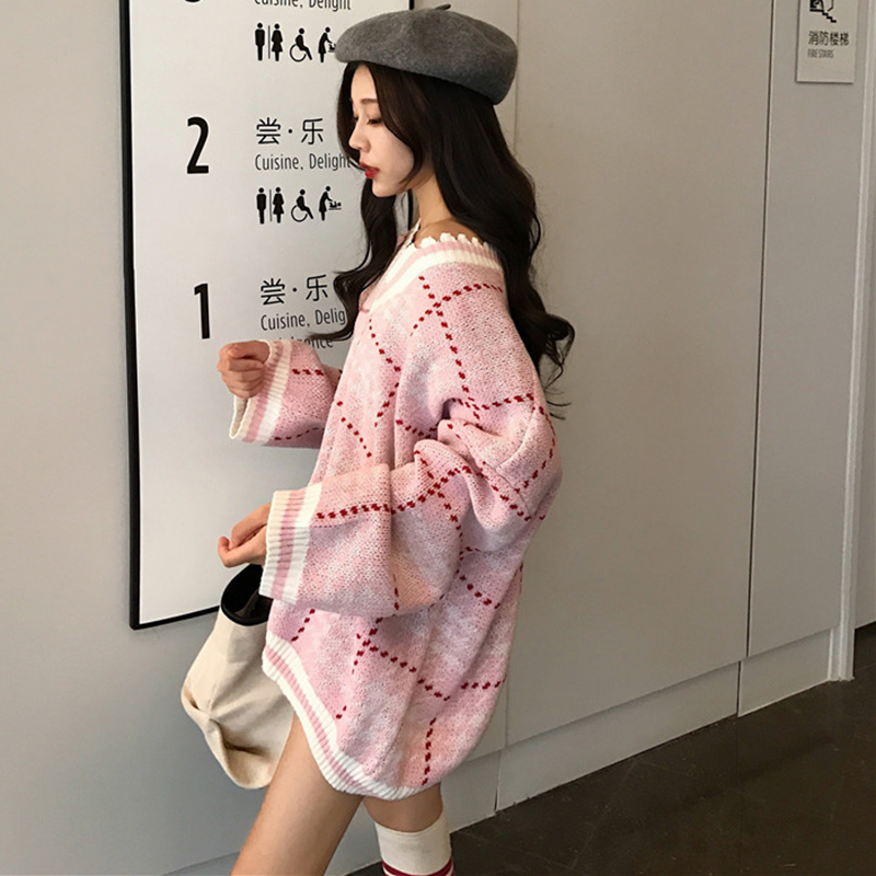 V領格子毛衣女秋冬裝2018新款寬松慵懶針織外套學生長袖休閑上衣