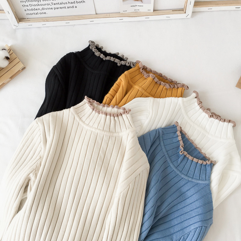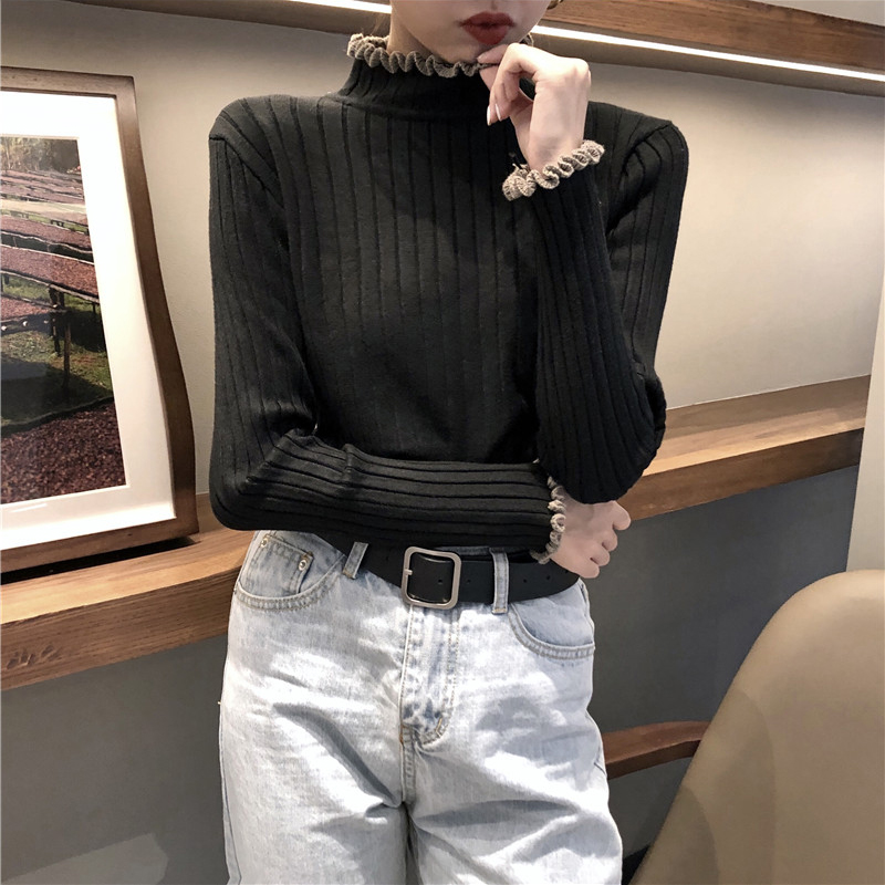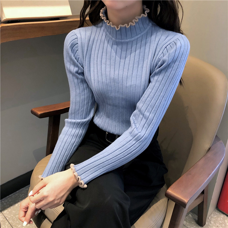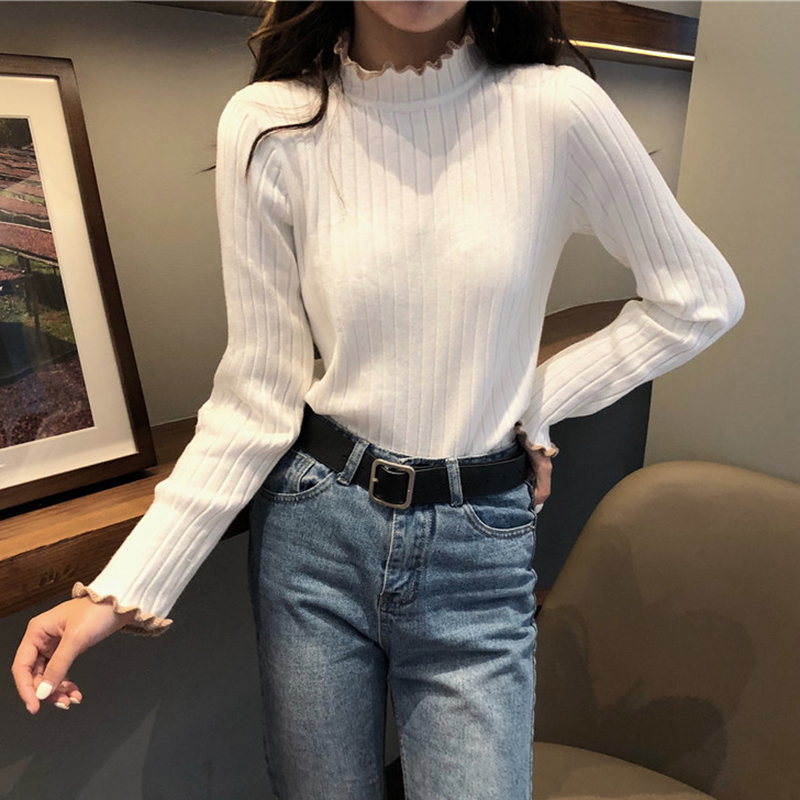 chic半高領木耳邊長袖針織衫女冬裝2018新款韓版氣質修身打底毛衣