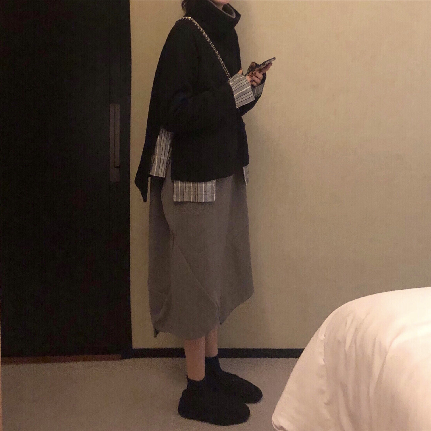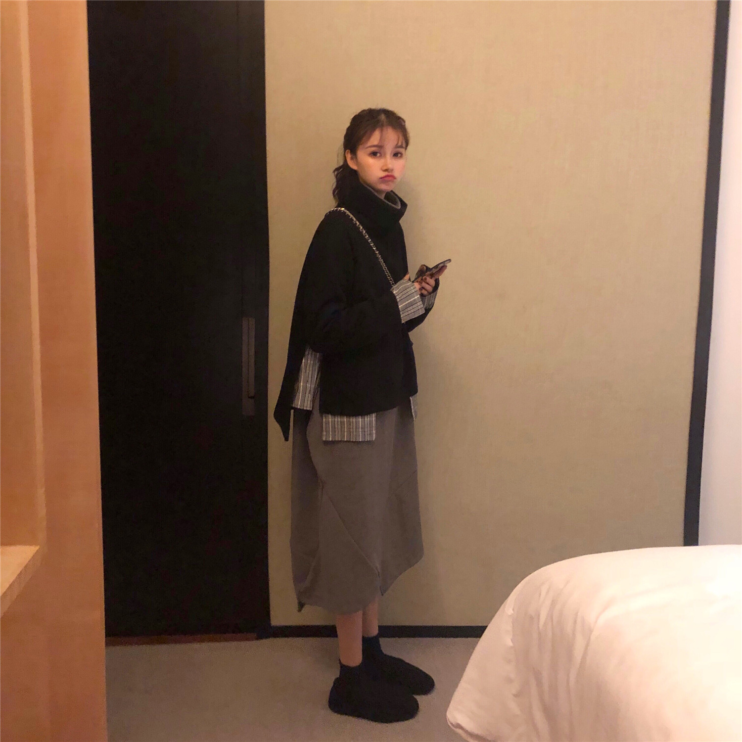 / 韓版慵懶風上衣高領拼接呢子外套女+寬松打底中長款連衣裙兩件套