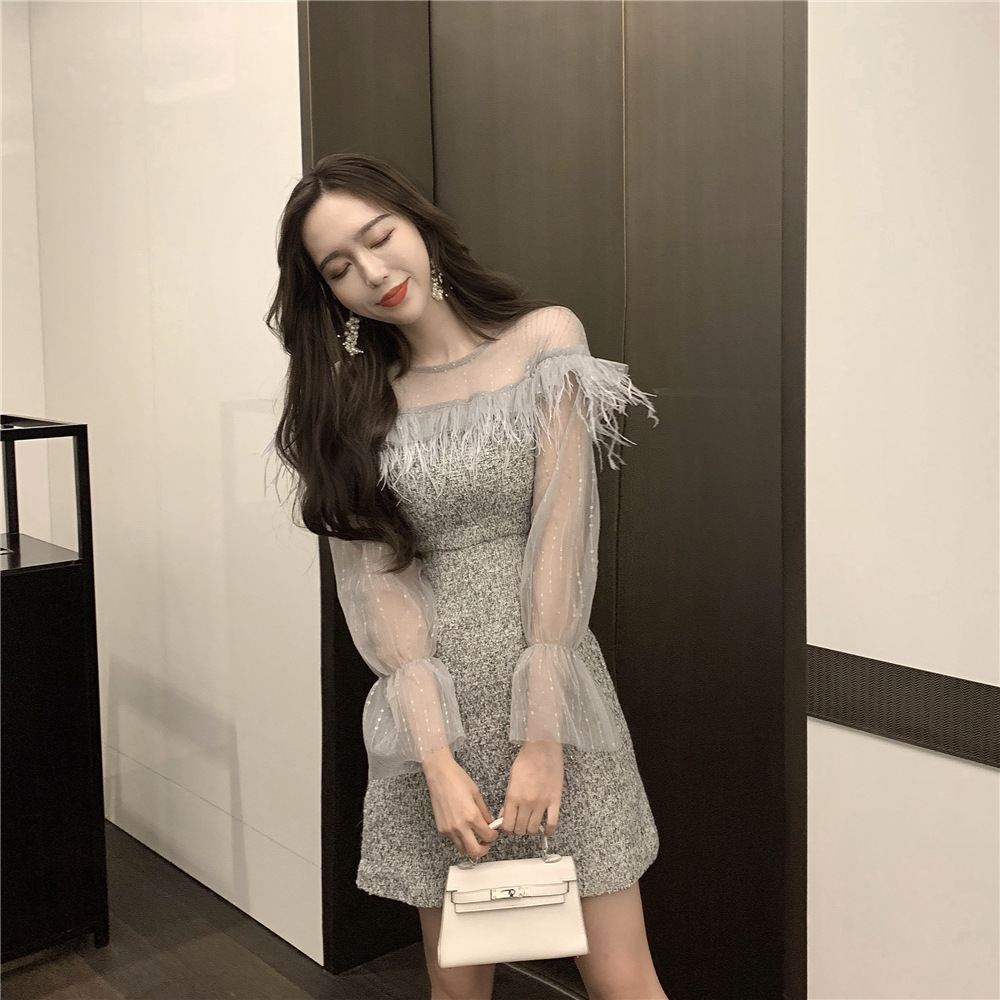 初冬溫柔風女冬裝2018新款時尚高腰羽毛氣質流蘇百搭A字連衣裙女