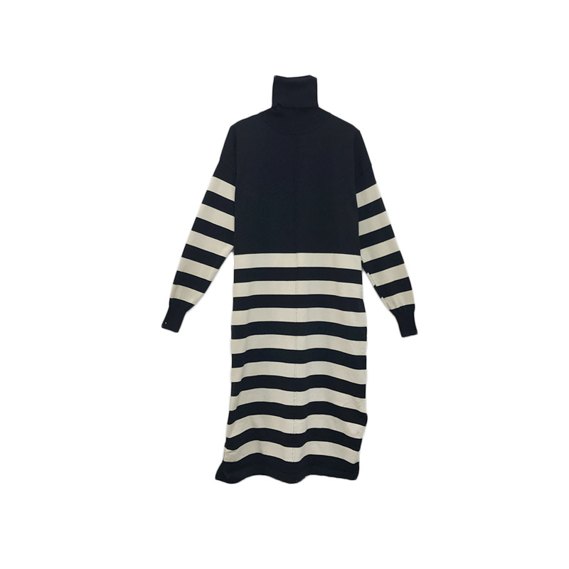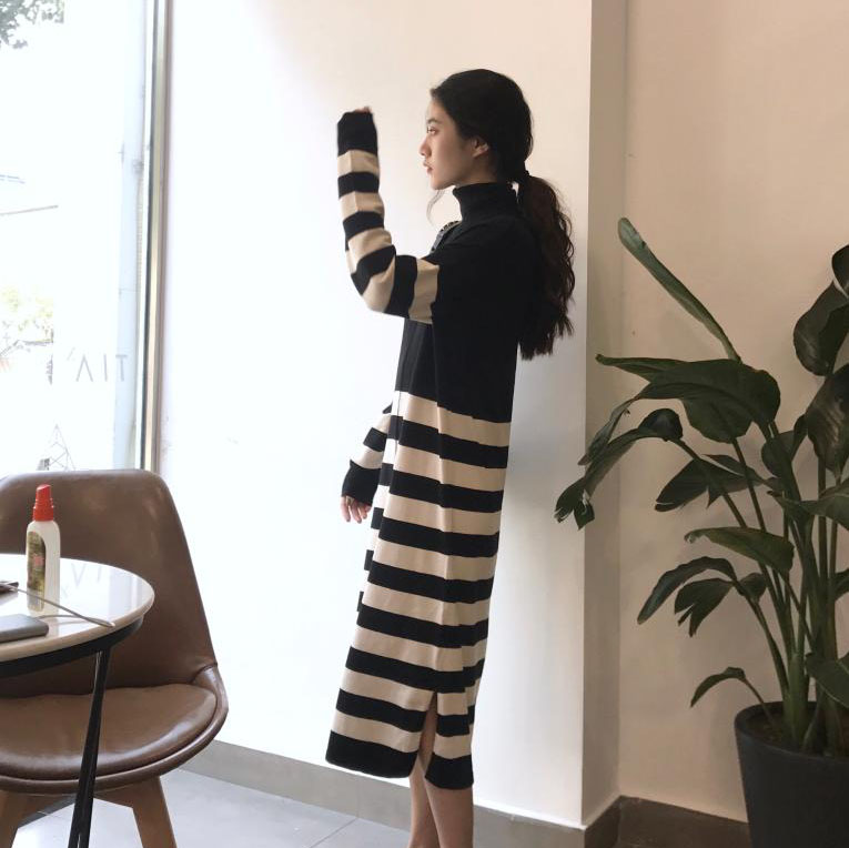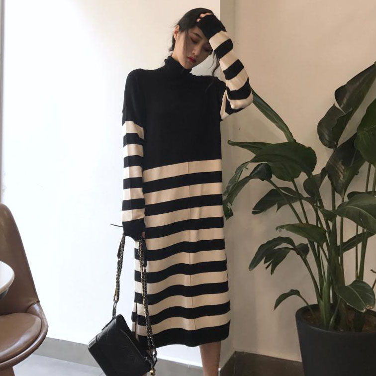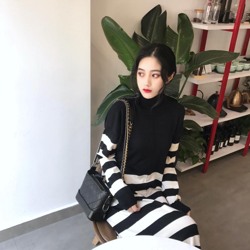/ 韓版女裝秋裝2018新款時髦百搭拼接高領條紋針織裙過膝長款連衣裙