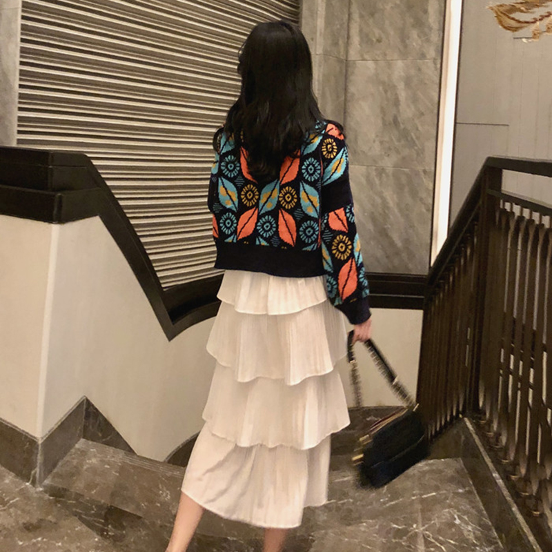 / 韓版時尚套裝女秋季新款寬松幾何長袖短針織毛衣高腰蛋糕半身裙子