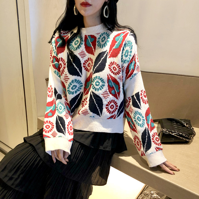韓版時尚套裝女秋季新款寬松幾何長袖短針織毛衣高腰蛋糕半身裙子