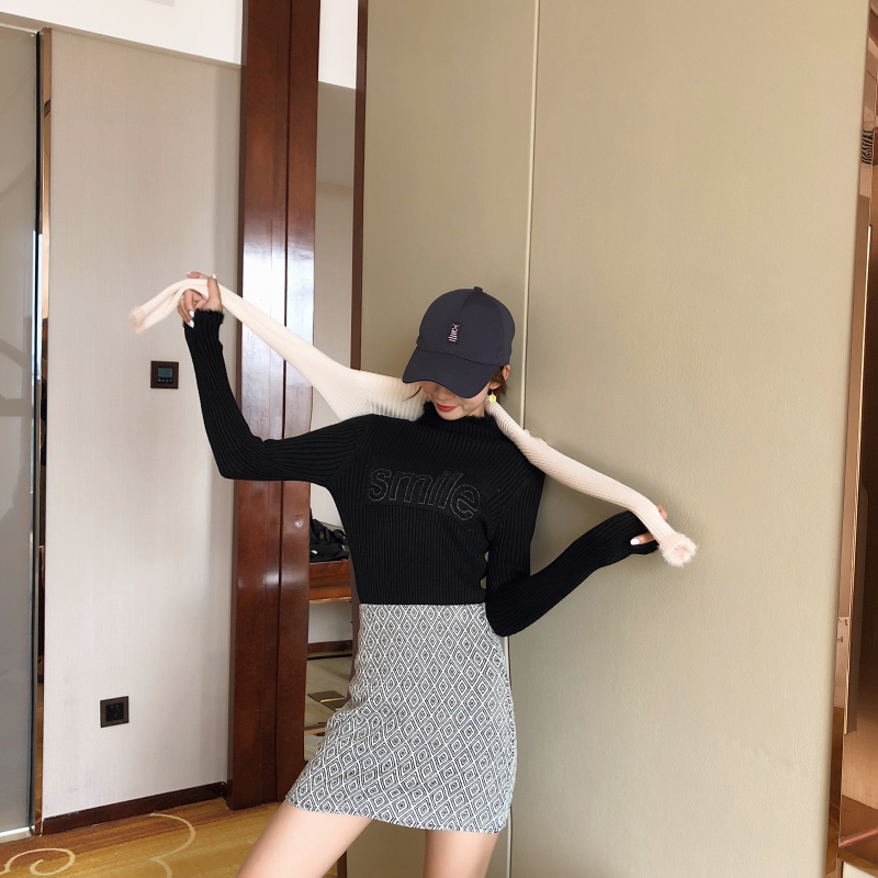 毛衣女2018新款修身半高領拼接字母加厚針織衫長袖套頭打底毛衣潮