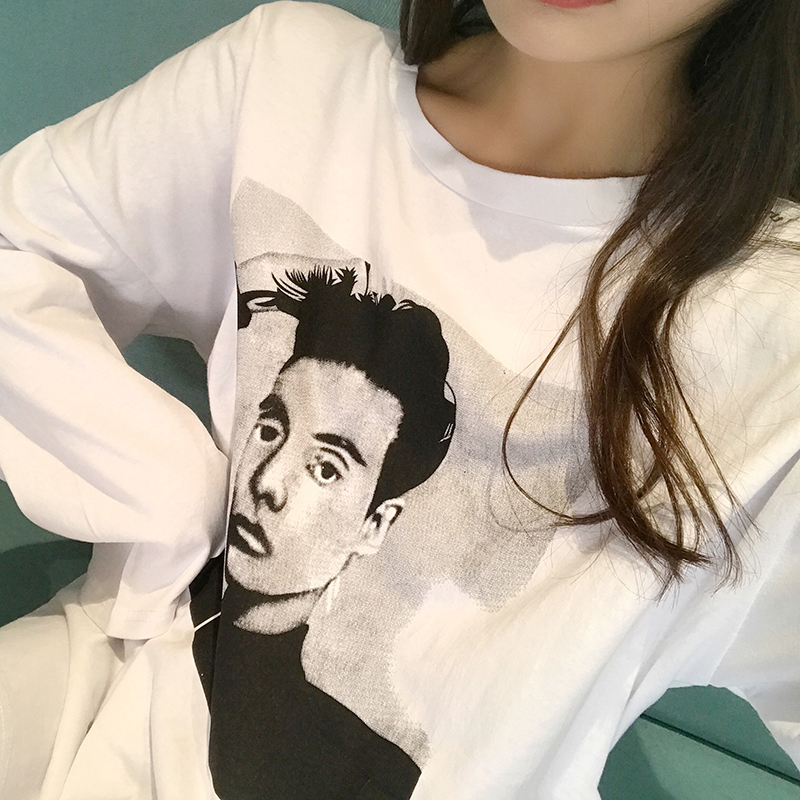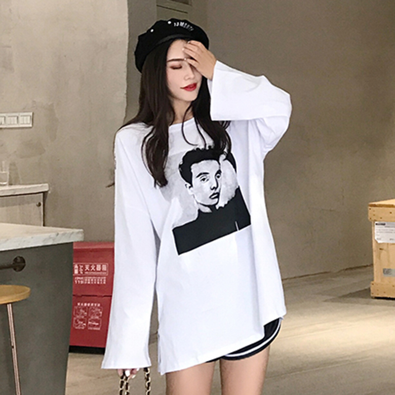 / 時尚人物印花T恤女秋裝新款圓領寬松長袖體恤開叉中長款休閑上衣